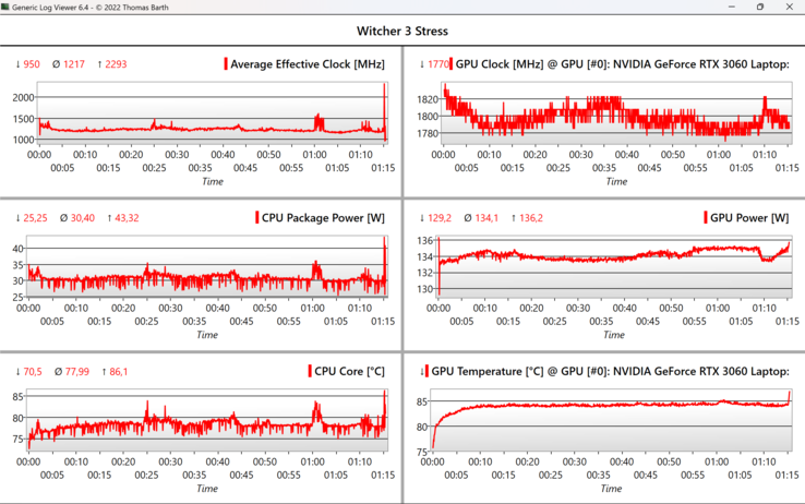 Selbst beim kombinierten Stresstest rechnet die CPU noch leicht über dem Basistakt von 3,2 GHz, während sie in den ersten 40 Minuten 86 °C warm wird und danach 93 °C, da sich die kombinierte TDP zu Gunsten der CPU verschiebt und diese sich somit auf 4 GHz erholt. Die GPU-Temperatur beträgt dabei 86 °C, während sie noch mit ~1.400 MHz taktet.