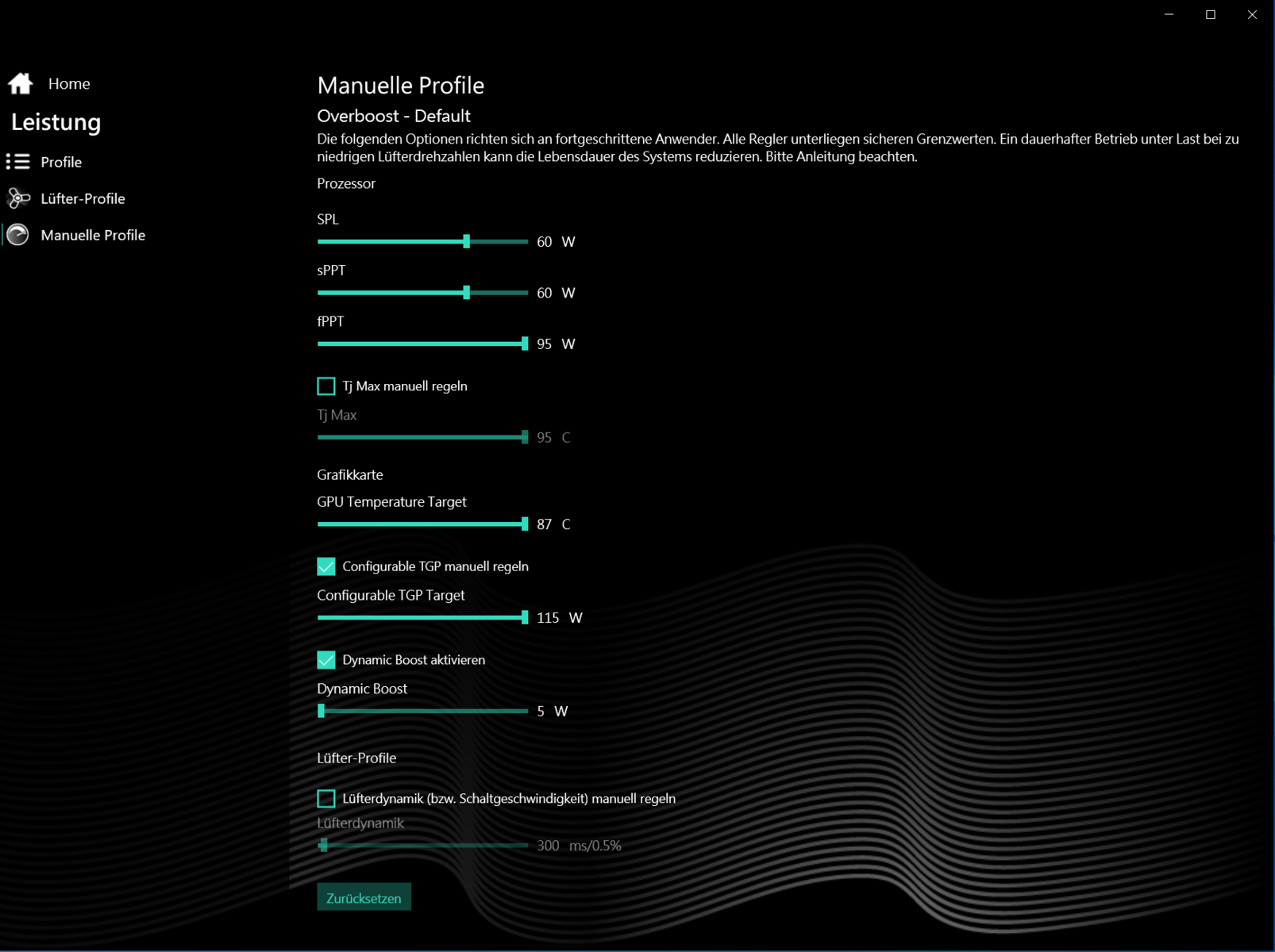 Der Grafikkern kann mit der maximal möglichen TGP von 130 Watt betrieben werden. Dazu muss der Dynamic Boost per Control Center auf 15 Watt erhöht werden. Schenker setzt die TGP im Auslieferungszustand auf 120 Watt (115 Watt + 5 Watt Dynamic Boost).