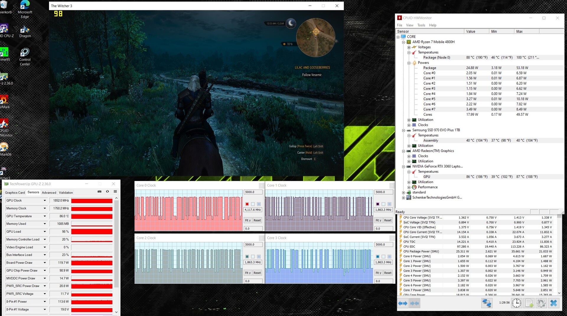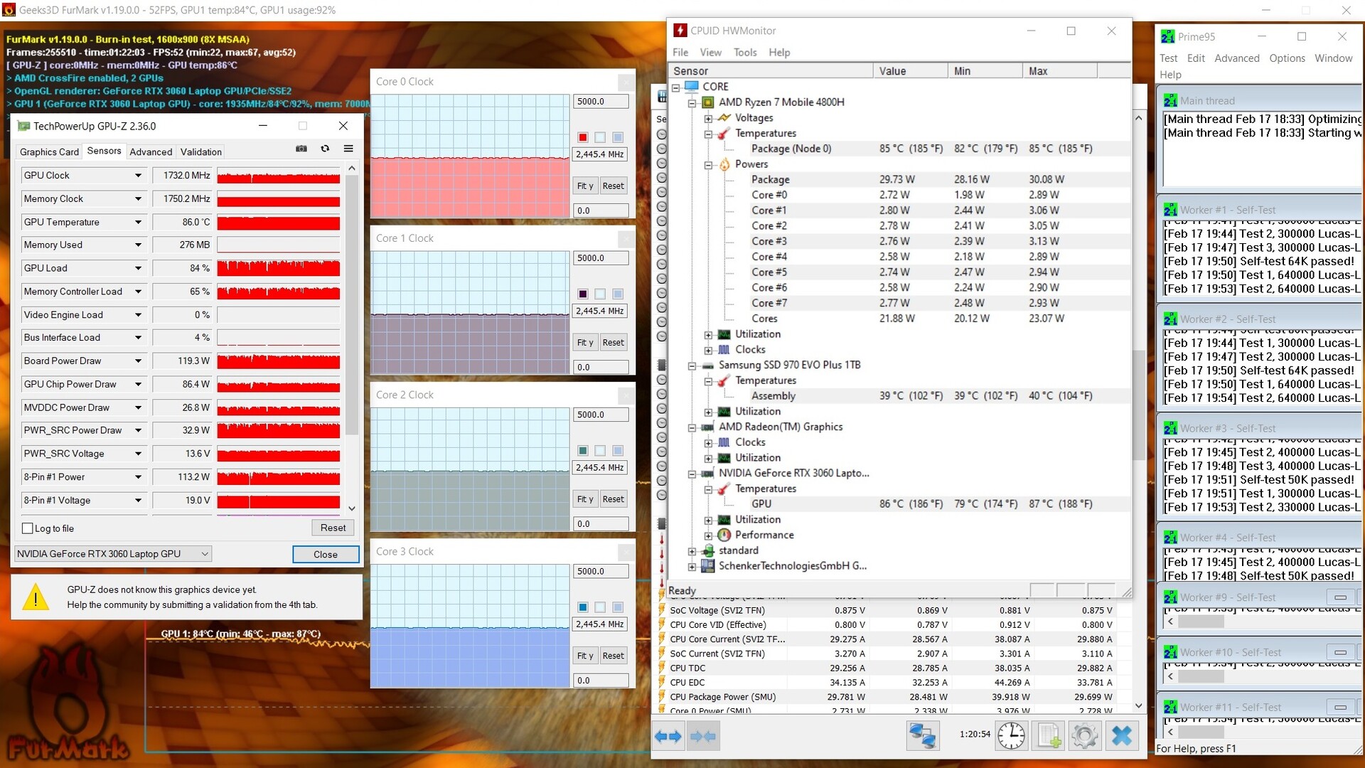 Unseren Stresstest (Prime95 und Furmark laufen für mindestens eine Stunde) durchlaufen CPU und GPU mit 2,4 bis 2,5 GHz bzw. 1.732 MHz. Der Stresstest stellt ein Extremszenario dar, welches so im Alltag nicht auftritt. Wir überprüfen mit diesem Test, ob das System auch bei voller Auslastung stabil läuft.
