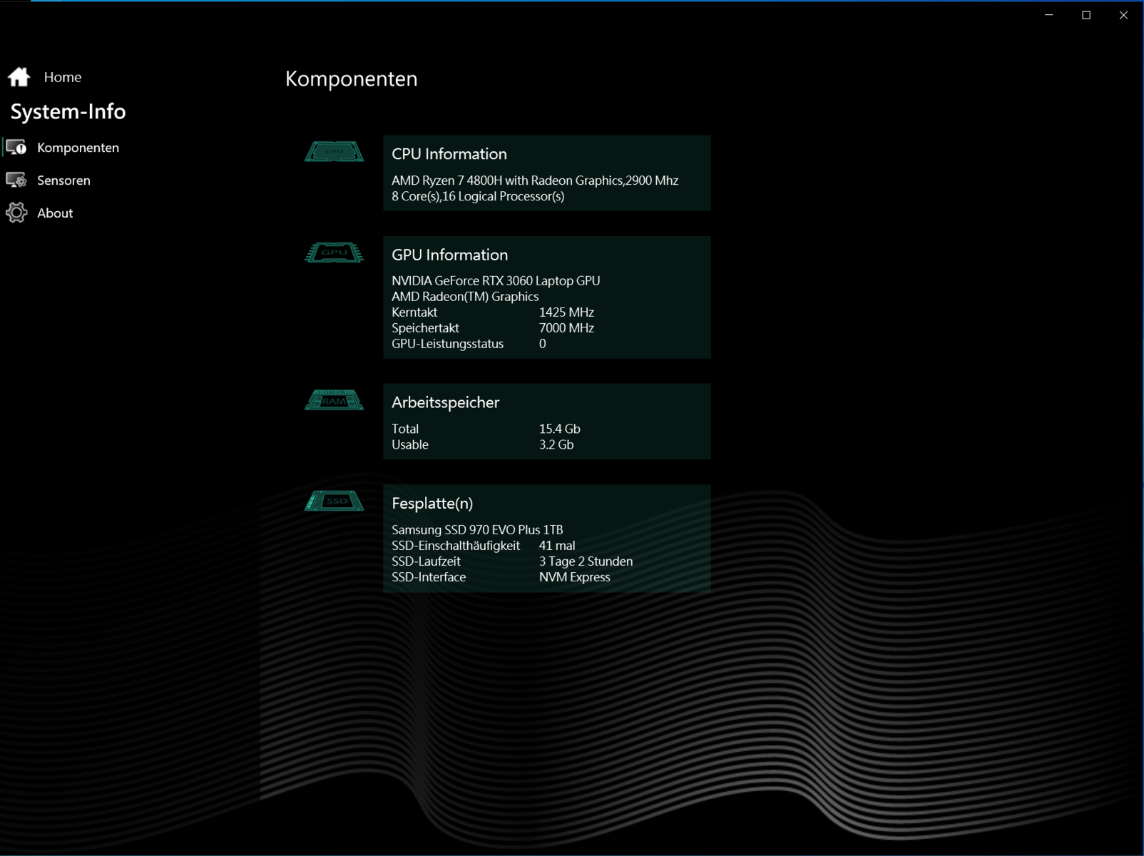 | Schenker XMG Core 15 Ampere R7 4800H, GeForce RTX 3060 Laptop GPU, 62 Wh | Asus TUF Dash F15 FX516PR i7-11370H, GeForce RTX 3070 Laptop GPU, 76 Wh | Aorus 15G XC i7-10870H, GeForce RTX 3070 Laptop GPU, 99 Wh | HP Omen 15-en0375ng R7 4800H, GeForce RTX 2060 Mobile, 70.9 Wh | Acer Predator Triton 300 PT315-52-79LP i7-10750H, GeForce RTX 2060 Mobile, 58.7 Wh | Schenker XMG Core 15 GK5NR0O R7 4800H, GeForce RTX 2060 Mobile, 62 Wh | Durchschnitt der Klasse Gaming | |