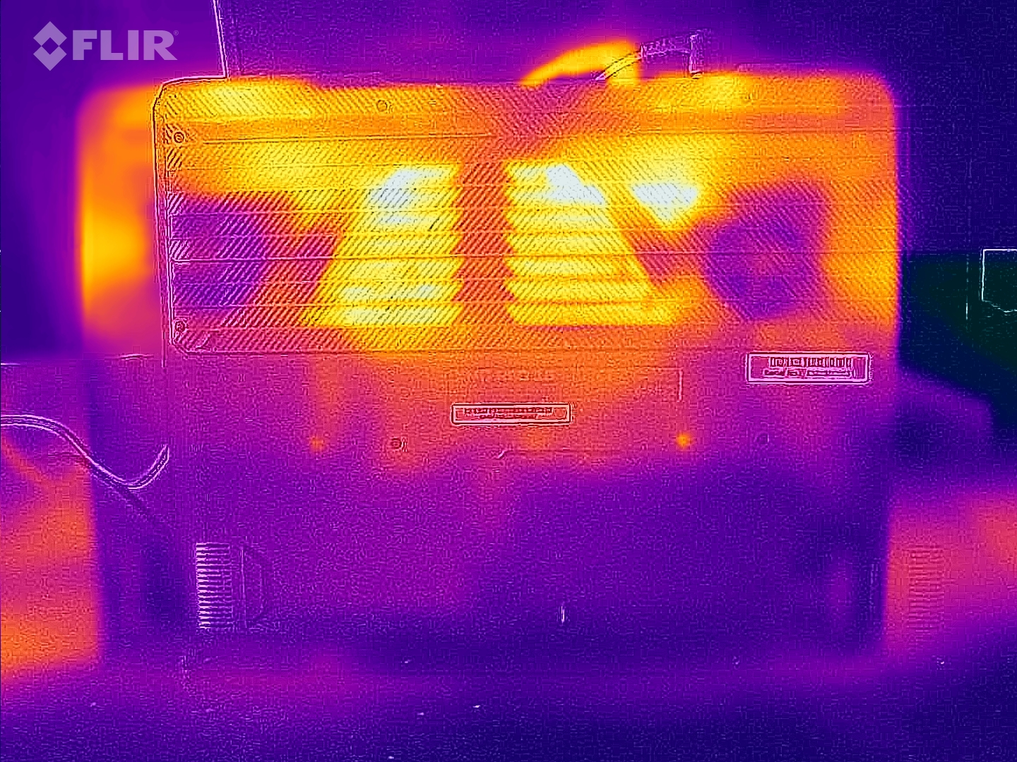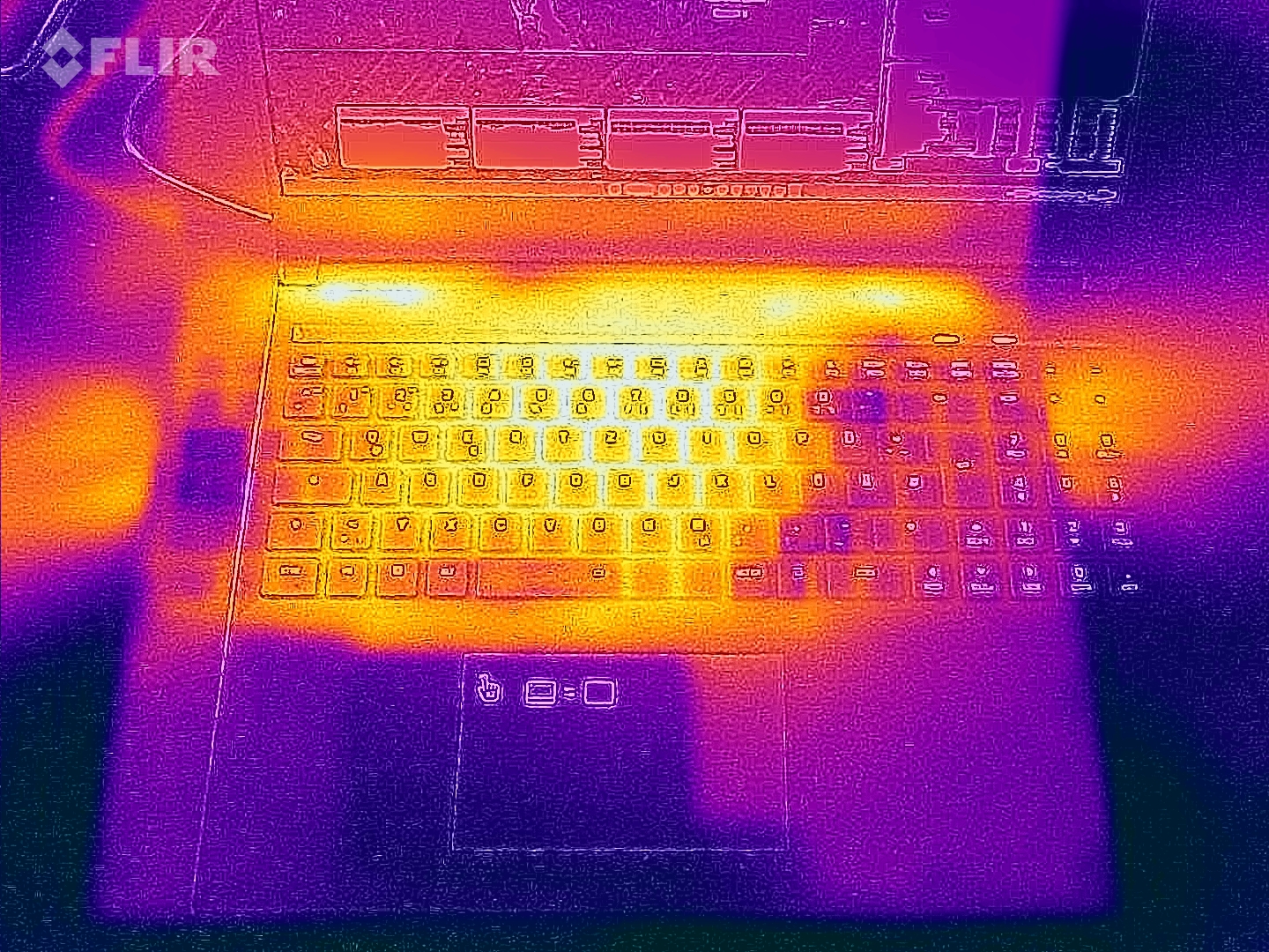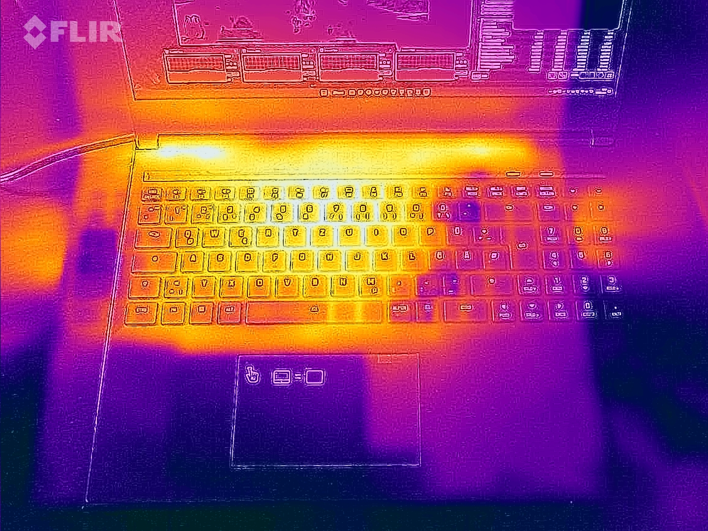Unter Last sind Werte bis etwa 50 °C messbar, was noch in Ordnung geht. Die Tastatur bleibt bei etwa 45 °C noch gut bedienbar. Speziell die Handballenauflagen sind mit knapp über 30 °C stets vergleichsweise kühl, was beim Spielen angenehm auffällt.