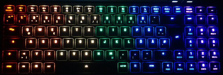 Am uns vorliegenden Testexemplar stellten wir zudem erhebliche Abweichungen zwischen der eingestellten Farbe und der Beleuchtung der Tasten fest. Insbesondere die Darstellung von "Weiß" als ein helles "Violett" auf der Tastatur irritierte. Auf unsere Nachfrage hin hat Schenker ein Exemplar mit baugleicher Tastatur nachgereicht. Beide Modelle sind laut Hersteller Seriengeräte. Beim zweiten Exemplar sind die Darstellungen tatsächlich erheblich besser und sehr nah an dran an der am Bildschirm eingestellten Farbe. Die Farbpalette wirkt allerdings weiterhin relativ begrenzt.