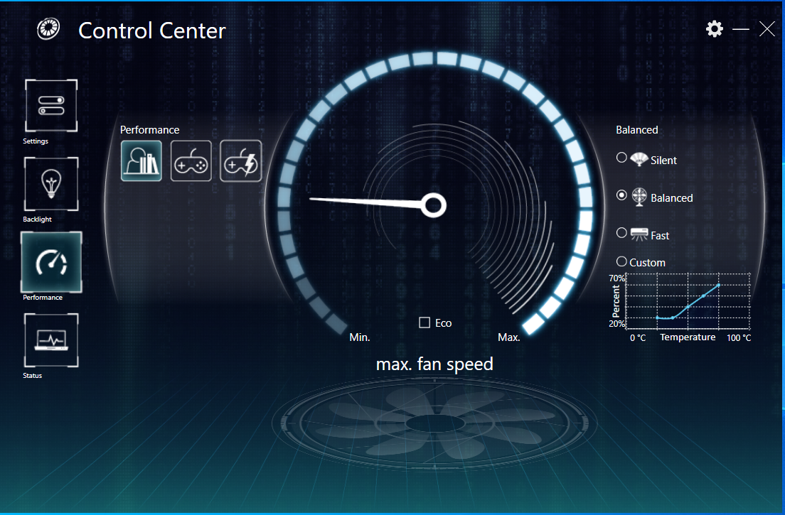 Das vorinstallierte Control Center ermöglicht die Überwachung des Systemstatus, die Anpassung der Tastenbeleuchtung und die Wahl eines Leistungsprofils ("Balanced", "Enthusiast", "Overboost"). Wir haben unseren Test bei aktivem "Enthusiast"-Profil und automatischer Lüftersteuerung durchgeführt. Einige Benchmarks haben wir auch bei aktivem "Overboost"-Profil durchlaufen laufen. Die Ergebnisse finden sich in den Vergleichsdiagrammen.