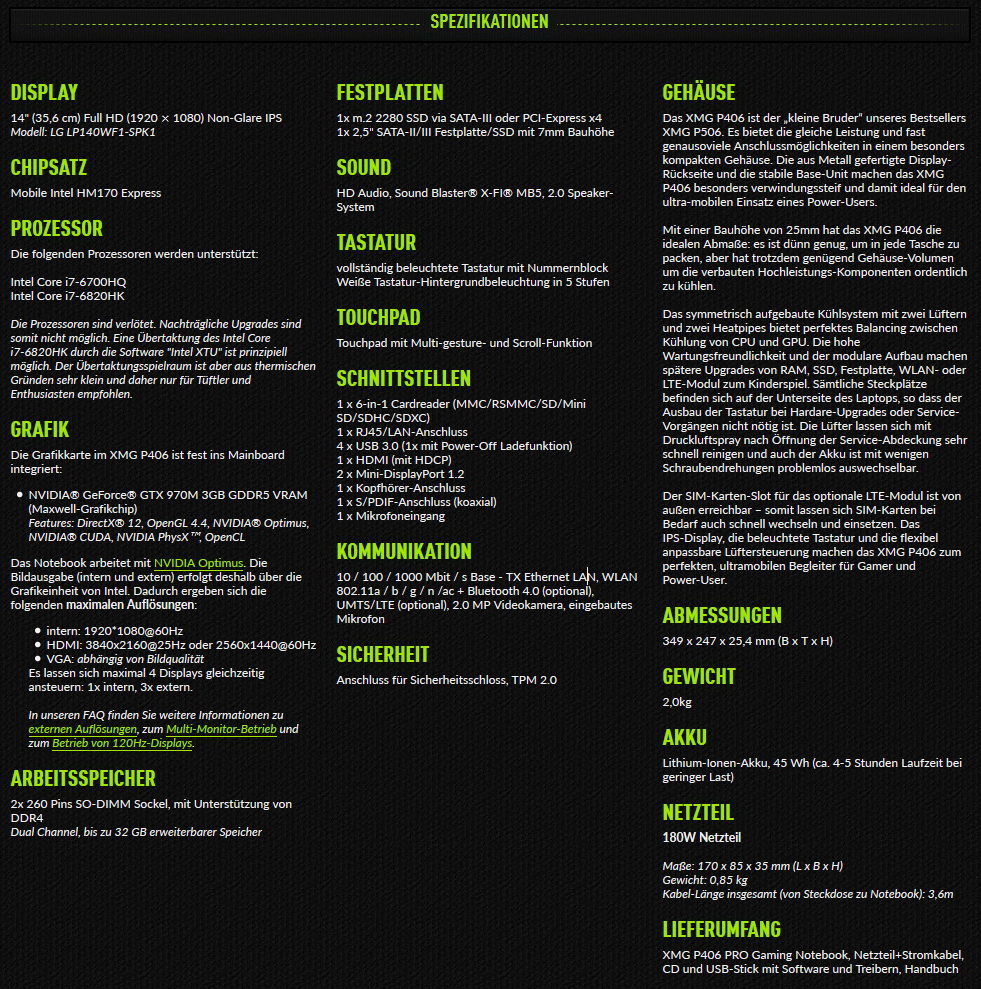 Optional ist das XMG P406 Pro auch mit einem Intel Core i7-6820HK 4-Kern-Prozessor zu haben. Aufpreis: knapp 140 Euro. Ferner kann das XMG P406 Gaming-Laptop bis zu 32 GB DDR4-RAM aufnehmen. Bei den Massenspeichern sind ebenfalls verschiedene SSD- und HDD-Modelle verfügbar. Alle Details und technischen Spezifikationen zum Schenker XMG P406 Pro gibt es in der Bilderstrecke unten im Specs Sheet.