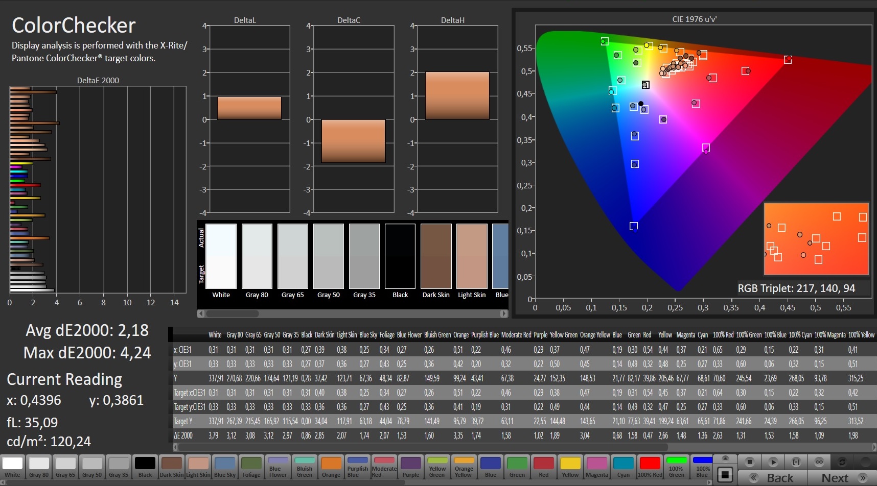 | Delta E Colorchecker * | 2.18 | 5.39 -147% | 4.62 -112% | 4.49 -106% | 4.36 -100% | 7.25 -233% |