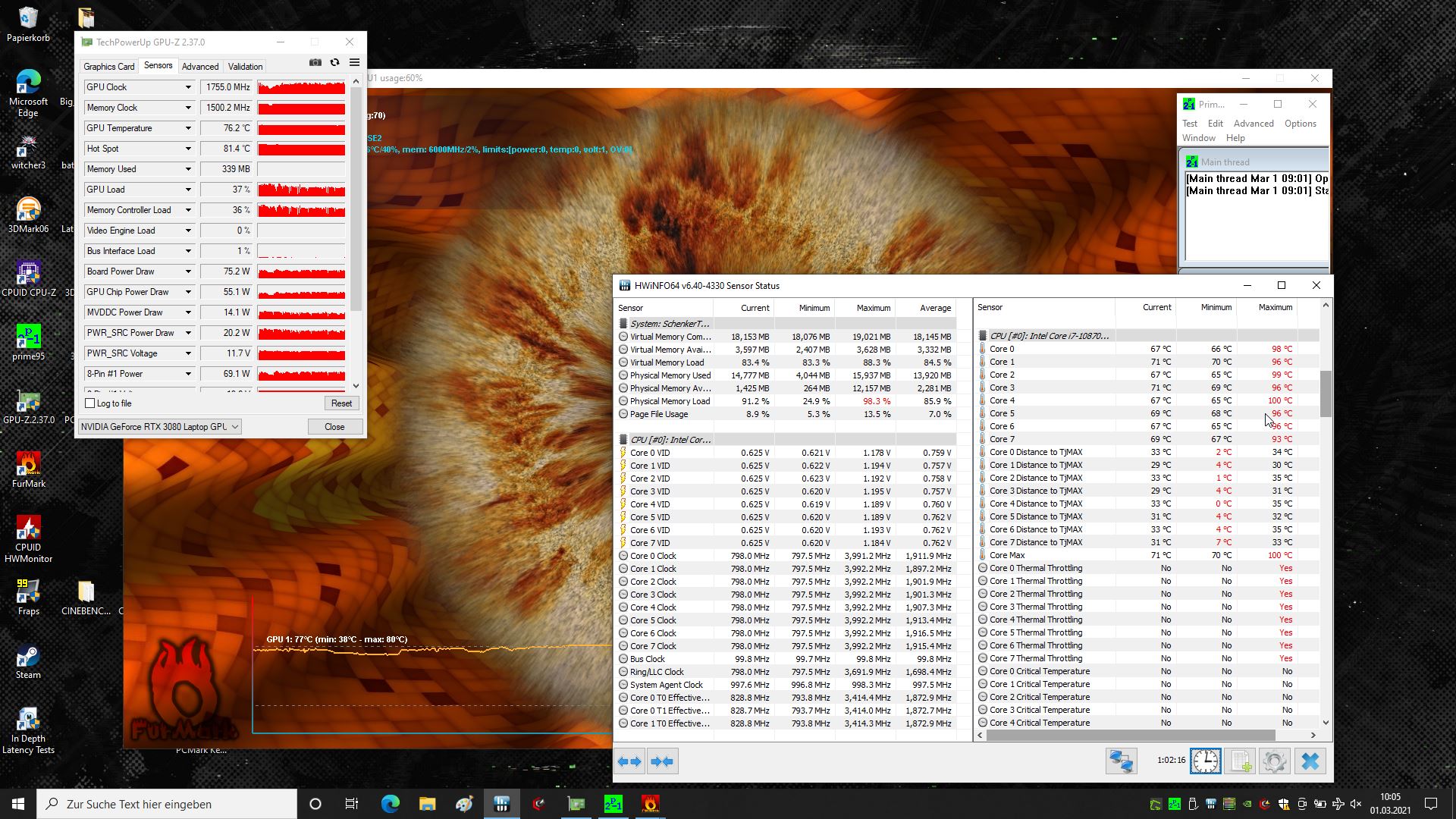 Zu Beginn unseres Stresstests takten die CPU-Kerne bei etwa 4 GHz, aber bereits nach 5 Minuten setzt die thermische Drosselung ein und die Werte gehen auf 2,2 GHz herunter, allerdings pendeln die Taktraten dann stark. Nach 7 Minuten messen wir kurzzeitige Kerntemperaturen von bis zu 97 °C, was wirklich hoch ist. Durch die Drosselung pendeln sich die Temperaturen zwischen 65 und 80 °C ein, die Taktraten pendeln besonders stark zwischen 800 MHz und 2,2 GHz.