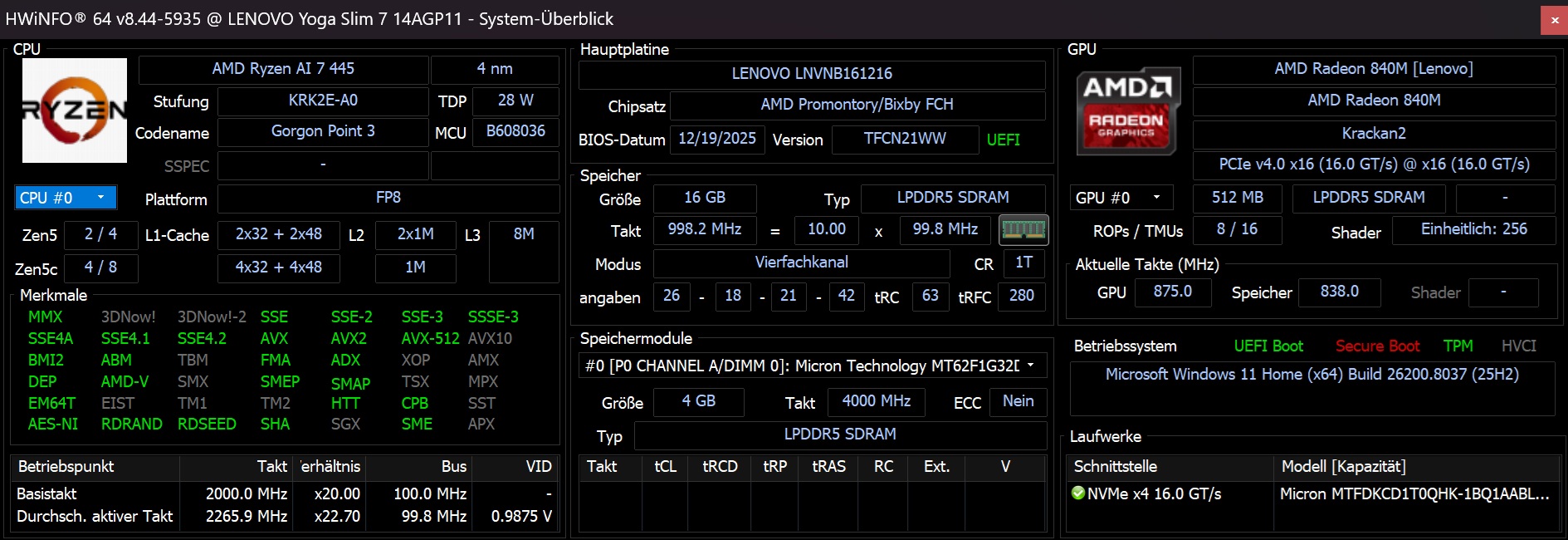 Das getestete Lenovo Yoga Slim 7a 14AGP11 mit Ryzen AI 7 445 ist ab rund 1.300 Euro bei diversen Shops erhätlich (z.B. Galaxus).
