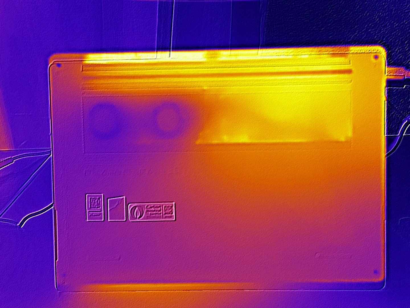 (-) Auf der Unterseite messen wir eine maximalen Wert von 46 °C (im Vergleich zum Durchschnitt von 39.3 °C).