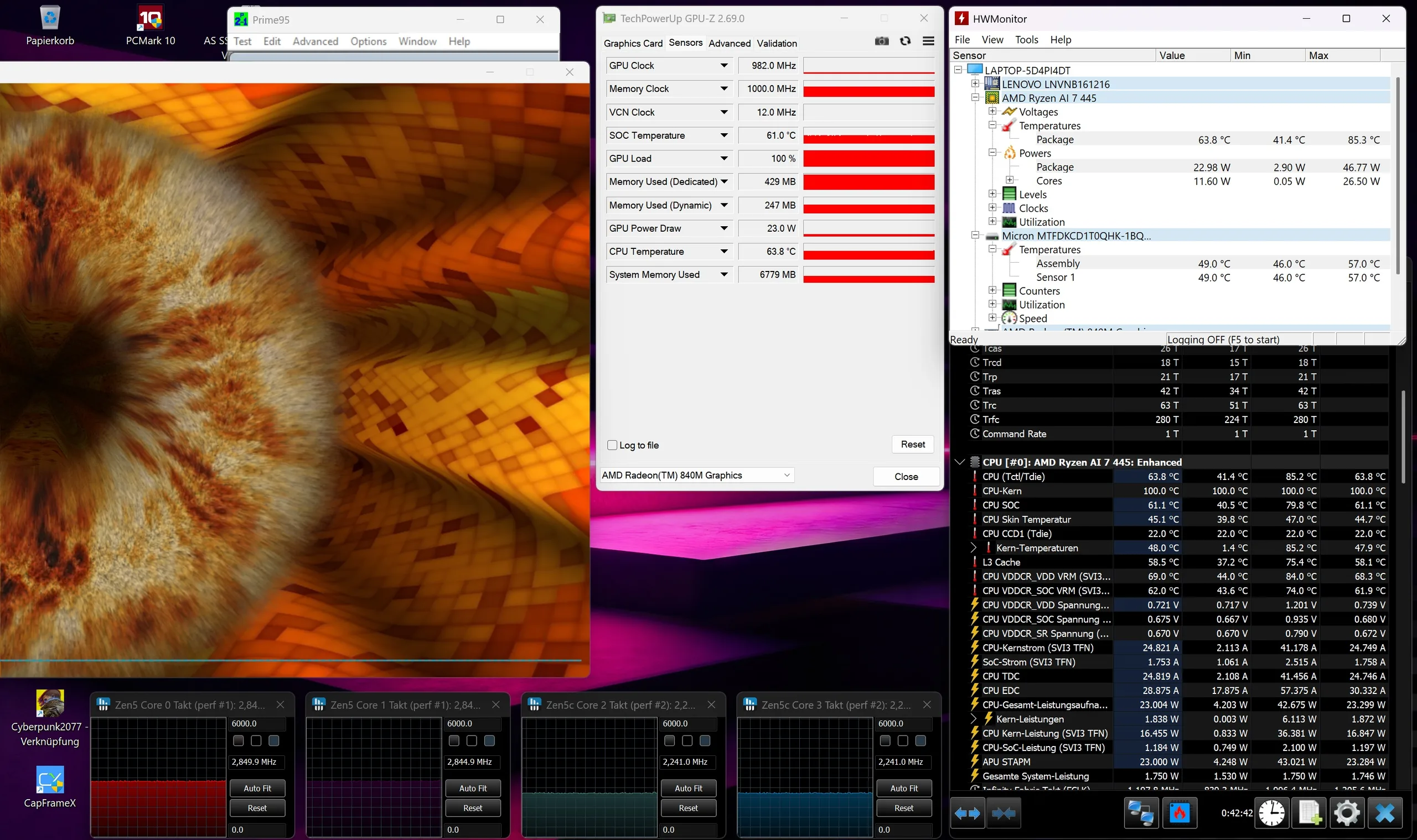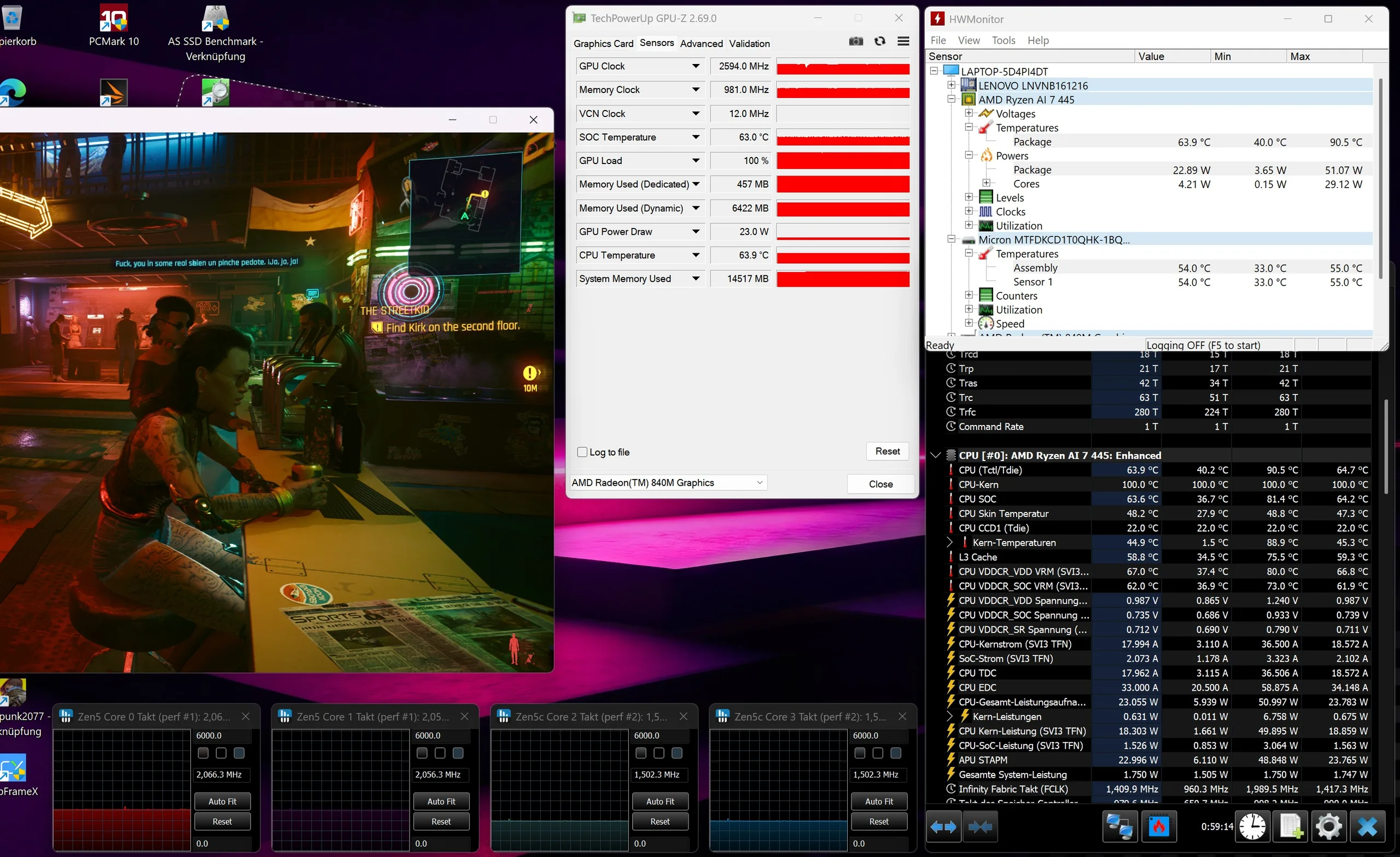 Der Ryzen AI 7 445 basiert auf AMDs Zen 5-Architektur (4 nm) und bringt 6 Kerne mit, die per SMT bis zu 12 Threads parallel bewältigen. Im CPU-Parcours fällt die Leistung etwas ernüchternd aus. So pendeln sich die Werte ungefähr auf dem Level des Core Ultra 5 226V ein. Der alte Ryzen AI 7 350, welcher 8 Kerne und 16 Threads bietet, war zumindest bei den Vergleichsgeräten ein ganzes Stück flotter unterwegs.