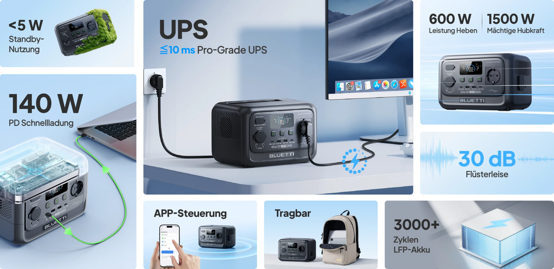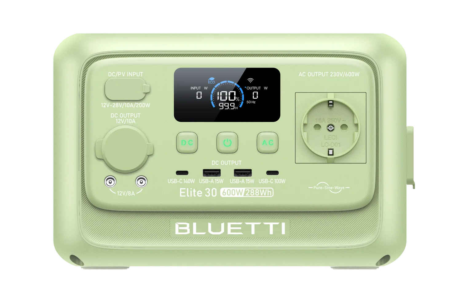 Abgesehen von der in frischen Farben getauchten Hülle unterscheiden sich die beiden neuen Varianten nicht vom dunkelgrauen Modell. Das bedeutet, dass Käufer in jedem Fall eine kompakte Powerstation mit 288 Wh LiFePO4-Kapazität erhalten, die mit insgesamt acht Anschlüssen aufwartet. Darunter ist auch eine AC-Steckdose, die bis zu 1.500 W Spitzen- und 600 W Nennleistung bereitstellt. So lassen sich viele Geräte im Haushalt auch fernab des Stromnetzes oder bei einem Stromausfall (hierfür hat die Elite 30 V2 eine ≤10 ms Pro-Grade-USV-Funktion) versorgen.