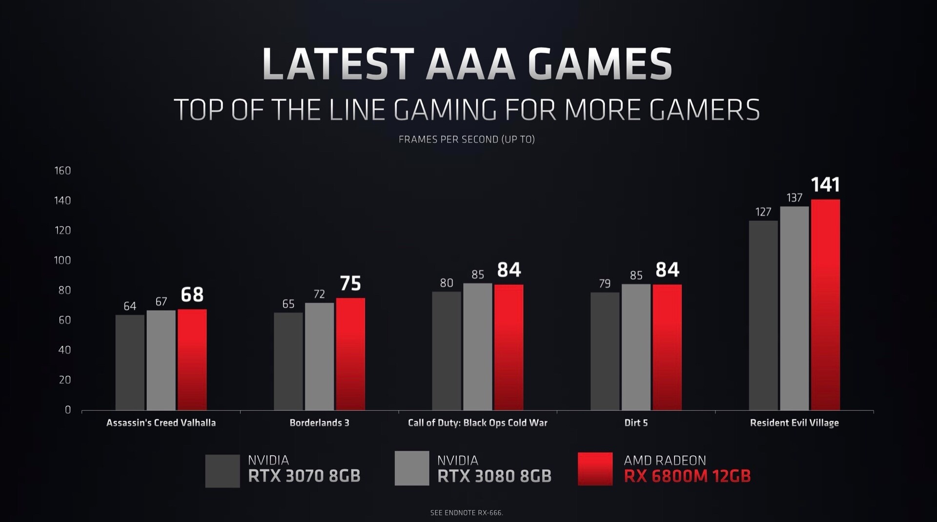 Update: In ersten unabhängigen Gaming-Benchmarks fällt die Radeon RX 6800M teils deutlich hinter der GeForce RTX 3080 zurück.