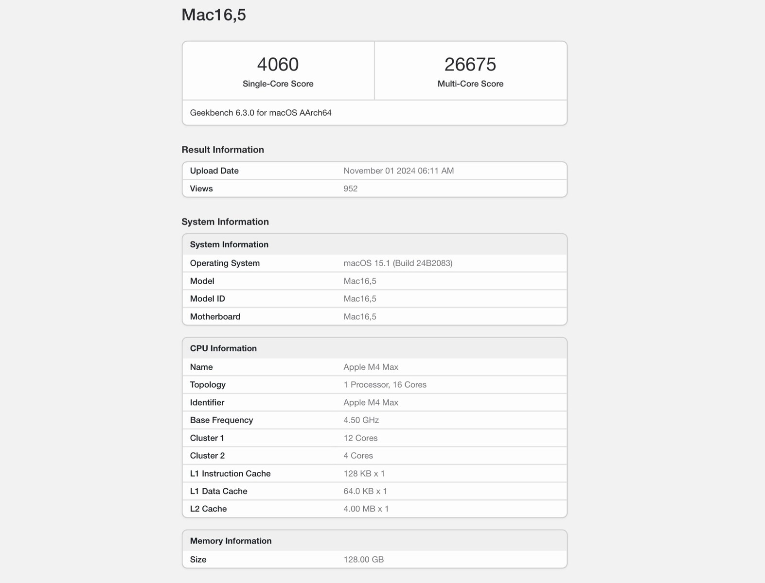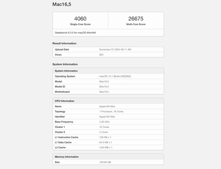 Nachdem der Apple M4 Pro bereits eine eindrucksvolle Performance bei Geekbench gezeigt hat, wurde nun auch ein erstes MacBook Pro mit Apple M4 Max bei Geekbench gesichtet. Das Ergebnis ist geradezu beeindruckend, denn der Chip erzielt 4.060 Punkte im Single-Thread-Benchmark, und 26.675 Punkte im Multi-Core-Benchmark.