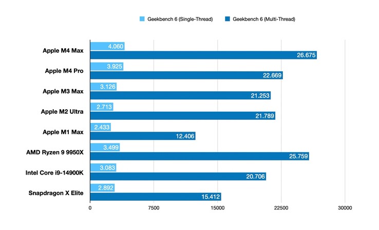 Der Apple M4 Max ist mehr als doppelt so schnell wie der Apple M1 Max, und 22,4 Prozent schneller als der Apple M2 Ultra. Beachtlich für einen Laptop-Chip ist, dass der M4 Max den AMD Ryzen 9 9950X (ca. 670 Euro auf Amazon) übertreffen kann, wenn auch nur um knappe 3,5 Prozent. AMDs aktueller Flaggschiff-Prozessor besitzt 16 Performance-Kerne, die Boost-Taktfrequenzen bis 5,7 GHz erreichen, sowie eine TDP von 170 Watt. Der Stromverbrauch der CPU des Apple M4 Max sollte ähnlich wie beim Apple M3 Max bei rund 56 Watt liegen.