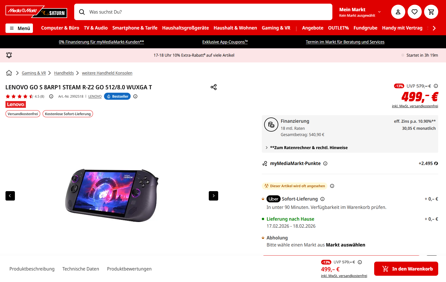Lenovo hält mit der Legion-Go-S-Reihe eine Serie von mobilen PC-Gaming-Konsolen bereit. Als Betriebssystem diente ursprünglich Windows 11, später erschienen auch Varianten mit SteamOS. Letzteres stellt eine speziell auf Gaming ausgelegte Linux-Distribution dar. Aktuell führen Mediamarkt.de und Saturn.de ein SteamOS-Modell des Handhelds zu einem Angebotspreis von 499 Euro im Sortiment. Wir konnten sowohl ein Windows-11-Modell (Note: „Gut (78%)“) als auch ein SteamOS-Modell (Note: „Gut (82%)“) des Legion Go S testen.