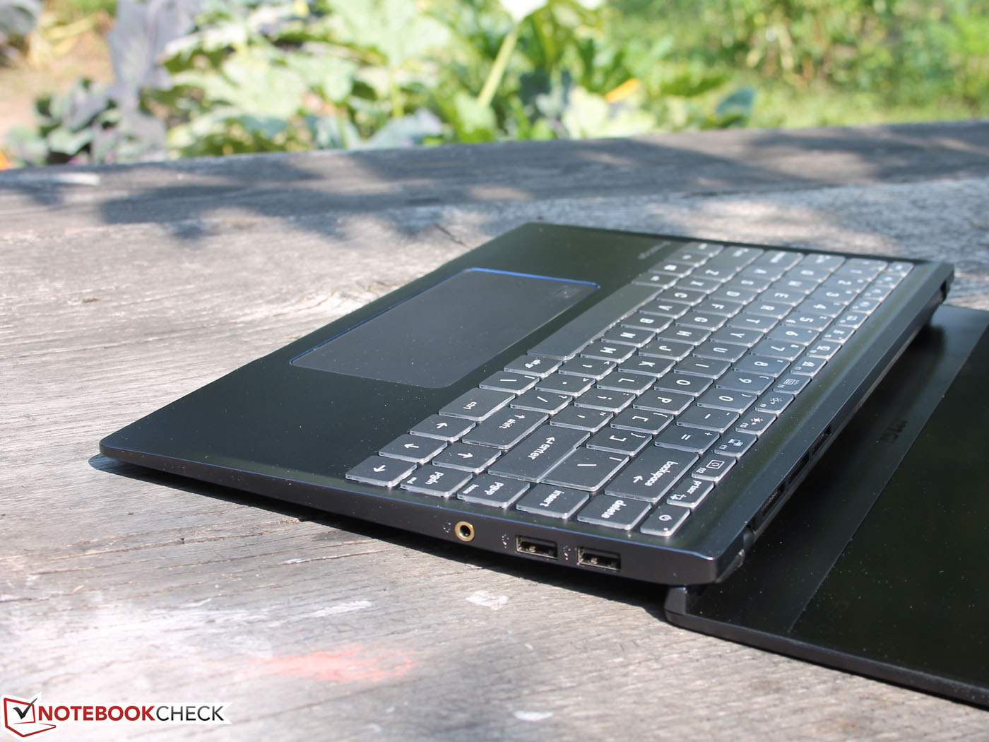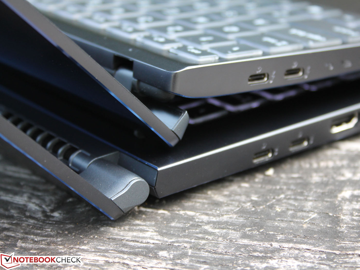 Wir konnten die Gehäuse vom 14- und vom 15-Zöller in Augenschein nehmen. Optisch unterscheiden sich die Laptops offenbar wenig, doch es gibt einen markanten Unterschied: Der 14-Zöller hat ein anderes Scharnier-Design. Bei aufgeklapptem Display hebt sich die Baseunit deutlich an, ca. 1 cm. Das ist gewollt, so kommt mehr Frischluft unter die Baseunit, dort saugt das Kühlsystem diese an. Zudem wird die Tastatur um 5° angewinkelt, so ist die Schreib-Ergonomie unter Umständen etwas besser.