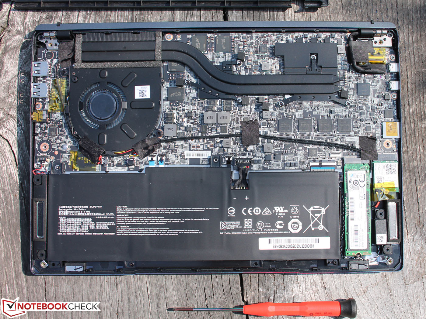 Der 14-Zöller kann sehr einfach geöffnet werden, dazu müssen lediglich die Kreuzschlitz-Schrauben auf der Unterseite gelöst werden. Mit einem passenden Hebelwerkzeug, wie einem Spatel, kann dann die Aluminium-Platte ausgehebelt werden. Leider ist beim Prestige 14 kein Platz mehr für einen Arbeitsspeicher-Sockel. Der RAM ist verlötet, lediglich die Einsteiger-Variante mit UMA-Grafik hat zwei RAM-Sockel. Bei unserem Testgerät mit dedizierter Grafikkarte bleibt also nur ein Wechsel des WiFi-Moduls, der SSD, des Akkus und eine Reinigung des Lüfters.