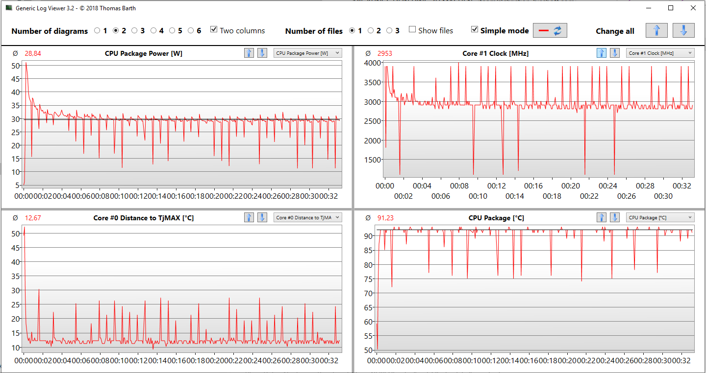 Von Seiten der Leistung kann es bei einem Intel Core i7-10710U zu einer hohen Schwankungsbreite kommen. Der Grund: Die Performance hängt stark vom konfigurierten TDP, von der Boost-Laufzeit und von der Kühlung ab. MSI hat sein Gerät sehr optimistisch konfiguriert, im Test erlaubt sich das CPU-Package eine Leistungsaufnahme von 30 Watt im Durchschnitt und 35-50 Watt in der Spitze. Das ist deutlich mehr als die TDP von 15 Watt erwarten lässt.