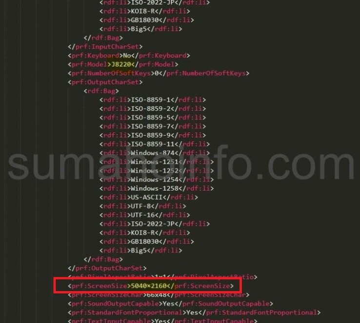 Unter Umständen könnten wir jedenfalls bereits zur IFA Anfang September ein Smartphone mit der extrem hohen Auflösung von 5.040 x 2.160 Pixeln sehen, wird aktuell auf Basis eines Screenshot aus einer vermeintlichen Uaprof-Konfigurationsdatei gemunkelt, welche diese Auflösung in Verbindung mit einem Sony-Smartphone mit der Modellnummer J8220 anführt, wie das Bild unten zeigt. Mit einer im Vergleich zum Xperia 1 von 6,5 Zoll auf 6,1 Zoll möglicherweise noch geschrumpften Displaydiagonale im 21:9-Format wären das wohl fast 900 ppi und damit knapp das doppelte des Üblichen. Zum Vergleich: Das Galaxy S10 ebenfalls mit 6,1 Zoll-Display bietet 550 ppi und wird gemeinhin nicht als unscharf wahrgenommen.