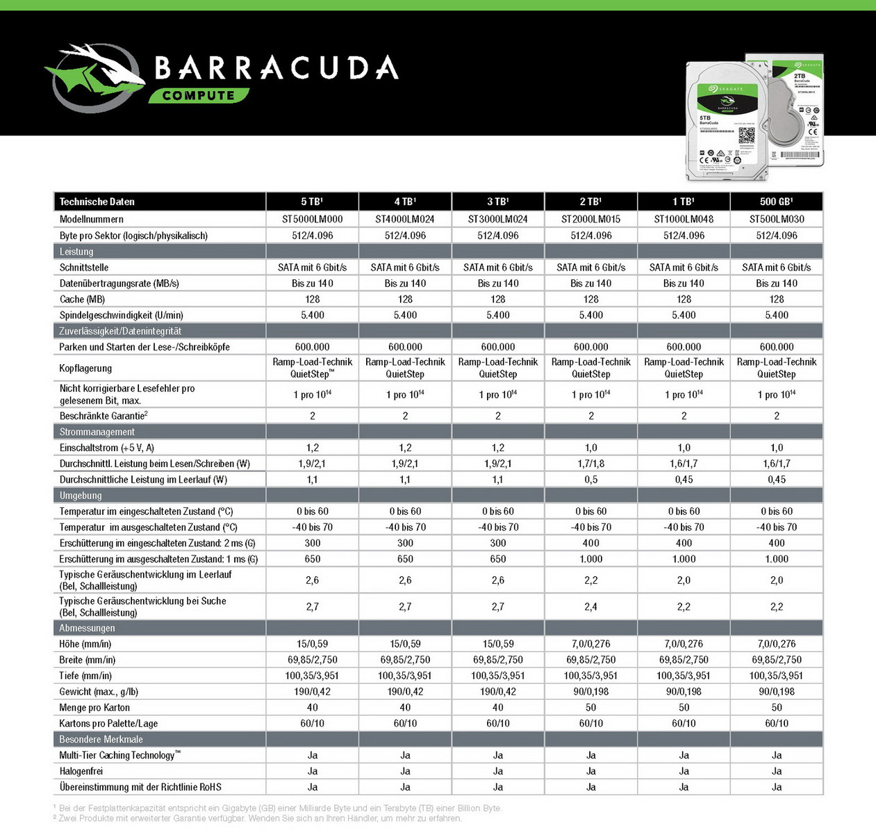 Die BarraCuda von Seagte wird in einem extrem dünnen Mobile- oder Laptop-Design mit 7 Millimetern und Kapazitäten von 500 GB, 1 TB und 2 TB sowie mit einer Bauhöhe von 15 Millimetern und 3 TB, 4 TB und 5 TB verfügbar sein. Beide Produkte nutzen als Basis 1 TB pro Scheibe und gehören zur neuen Guardian-Serie von Seagate.