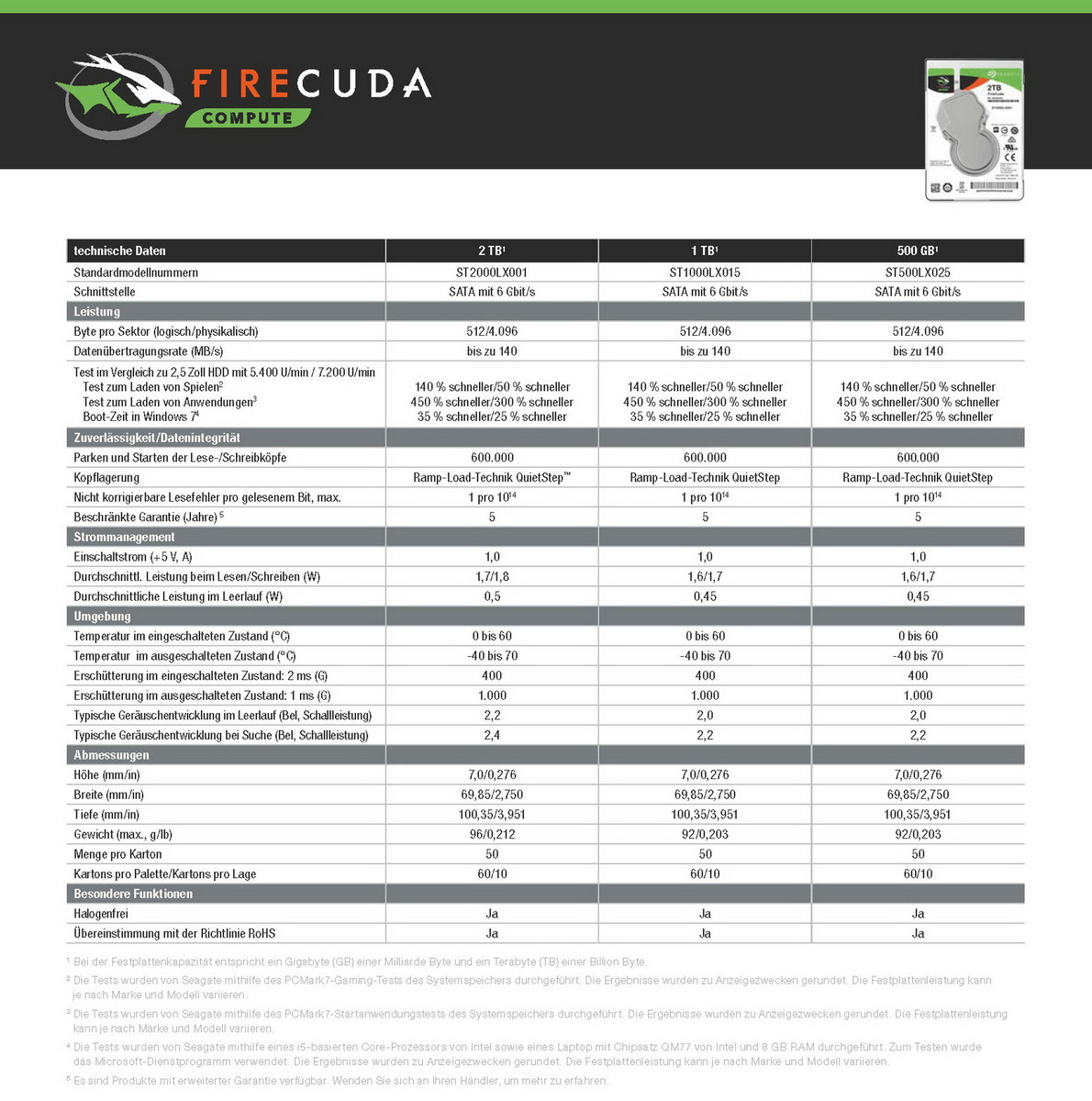 Dieses sogenannte Multi-Tier-Caching (MTC) optimiert die HDD auf Basis der jeweils durchgeführten Aktivitäten der FireCuda, um die Leistung der Festplatte besser auf die aktuellen Nutzung abzustimmen. Je nach Modell verspricht sich Seagate im Vergleich zu bisherigen 2,5-Zoll-HDDs mit 7.200 U/min einen enormen Performance-Vorteil der FireCuda-Serie. So soll beispielsweise das Laden im PCMark7-Gaming-Tests bis zu 50 Prozent schneller sein. Erhältlich ist die FireCuda mit 2,5 Zoll als Modell ST2000LX001 mit 2 TB, ST1000LX015 mit 1 TB sowie als ST500LX025 mit 500 GB.