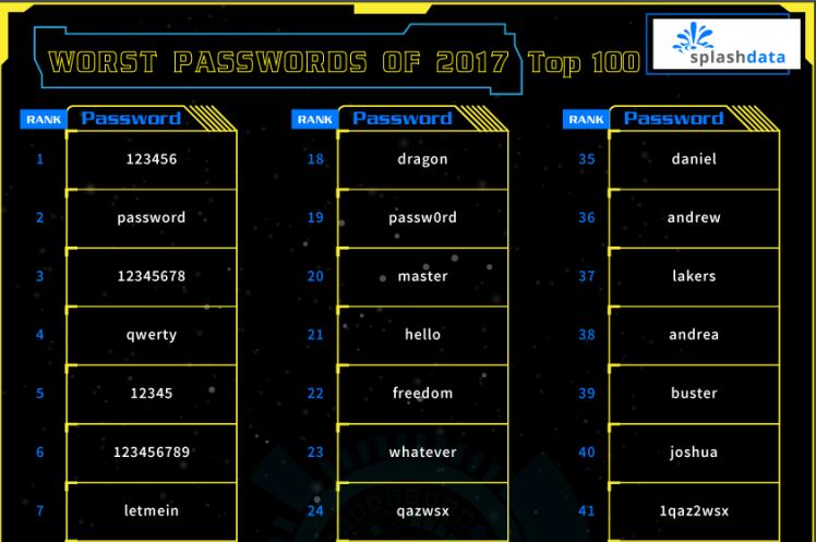 2017 war das Jahr der gehackten Datenbanken und Accounts. OneLogin, Verizon, Uber, Imgur, Disqus, und Netzbetreiber, diverse Hotelketten, nur um wenige zu nennen. Millionen von Zugangsdaten und somit auch Passwörter, salted Hash oder Klartext, wurden gestohlen und sind teilweise für jeden zugänglich ins Netz gestellt worden. Im Darknet wurde erst vor Kurzem in einem Forum eine Datenbank mit mehr als 1,4 Milliarden (!) Passwörtern, die zum Verkauf angeboten wird, entdeckt. Wie jedes Jahr präsentiert nun Splashdata die miserabelsten Passwörter des vergangenen Jahres, hier sind die Top 100 von 2017. Die ersten beiden Podestplätze gehen unverändert gegenüber dem Vorjahr an "123456" und "password".