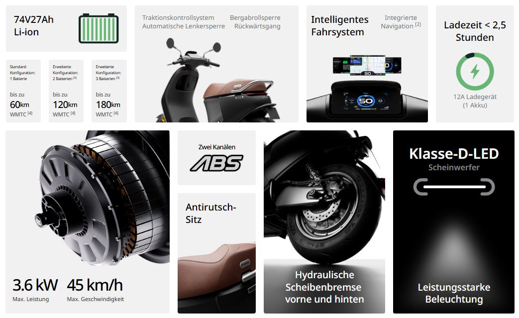 Der E150S-Scooter ist in gewisser Weise modular und lässt sich damit an die eigenen Anforderungen anpassen. So ist die Nutzung mit einem, zwei oder drei Akkus möglich, was einen Einfluss auf die Reichweite hat. Die WMTC-Reichweite mit einem Akku wird mit bis zu 60 Kilometern angegeben und soll sich dann dementsprechend verdoppeln oder verdreifachen. Da die jeweils knapp 2 kWh starken Akku nicht ganz günstig und auch nicht leicht sein dürften, können etwa Nutzer, die nur kurze Strecken in der Stadt zu bewältigen haben, damit Geld und Gewicht sparen.