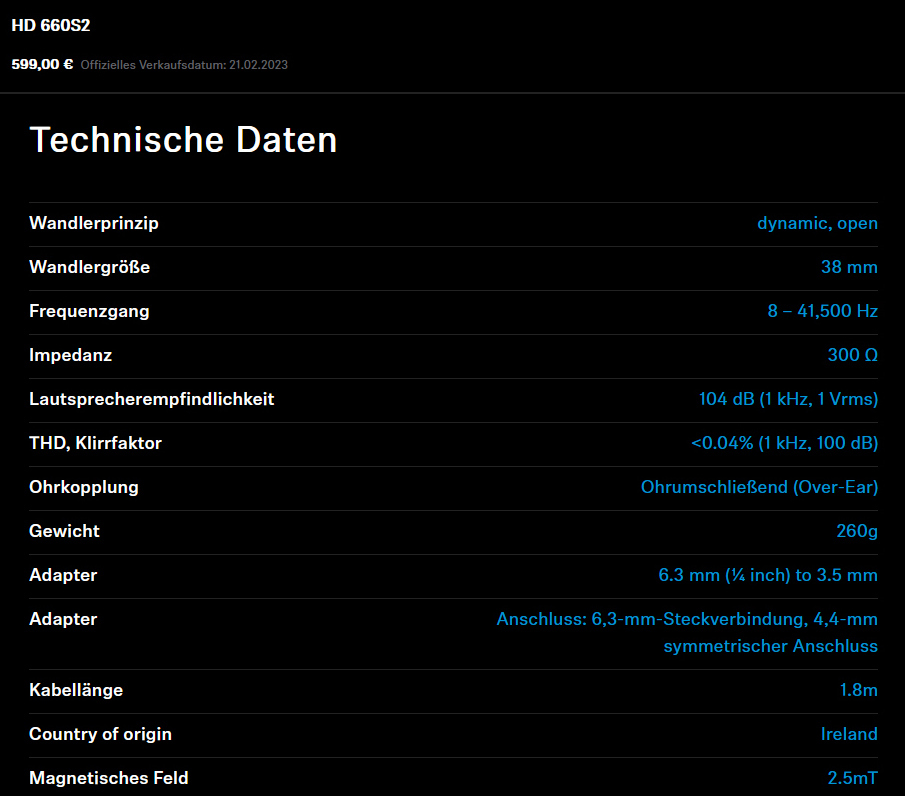 Der HD 660S2 von Sennheiser wird mit zwei 1,8 Meter langen, abnehmbaren Kabeln mit 6,3-mm- und 4,4-mm-Stereo-Klinkensteckern geliefert. Ein 3,5-mm-Adapter zählt ebenfalls zum Lieferumfang des HD 660S2 und ermöglicht die Verwendung mit beliebten Hi-Fi-Geräten wie DAC-Verstärkern, DAPs sowie Verstärkern wie dem Sennheiser HDV 820. Der Sennheiser HD 660S2 kann weltweit für 599 Euro (629 CHF) vorbestellt werden und wird ab dem 21. Februar 2023 geliefert.