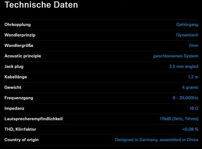 Sennheiser nennt für die IE 200 Kabel-In-Ear-Ohrhörer mit Dual Tuning und MMCX einen Frequenzgang von 6 bis 20,000 Hz sowie eine Lautsprecherempfindlichkeit von 119 dB (1kHz, 1Vrms). Den Klirrfaktor (THD) beziffert Sennheiser für die IE 200 Earbuds mit weniger als 0,08 Prozent. Zum Lieferumfang der IE 200 gehören neben den Kopfhörern, geflochtenem Kabel mit MMCX-Anschlüssen und 3,5-mm-Stecker sechs Polster aus Silikon und Memory Foam (S, M, L), eine Tasche sowie Sicherheitshinweise.