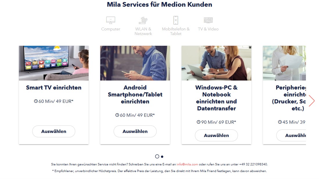 Medion verspricht sich durch die Zusammenarbeit mit Mila einen "günstigen und bezahlbaren" After-Sales-Service für seine Kunden. Je nach Bedarf sollen Medion-Kunden über das Mila Crowd-Netzwerk Hilfe von Privatpersonen als Mila Friends beim Installieren und Einrichten von PCs, Routern oder Smartphones bekommen. Bei komplexen technischen Fragen können Mila Profis als professionelle Technikdienstleister helfen. Die Preise können mit den Privathelfern direkt vereinbart werden. Als Richtwerte nennt Mila beispielsweise für das Einrichten des Smart-TVs oder Android-Smartphone (60 Min.) einen Preis von rund 50 Euro.