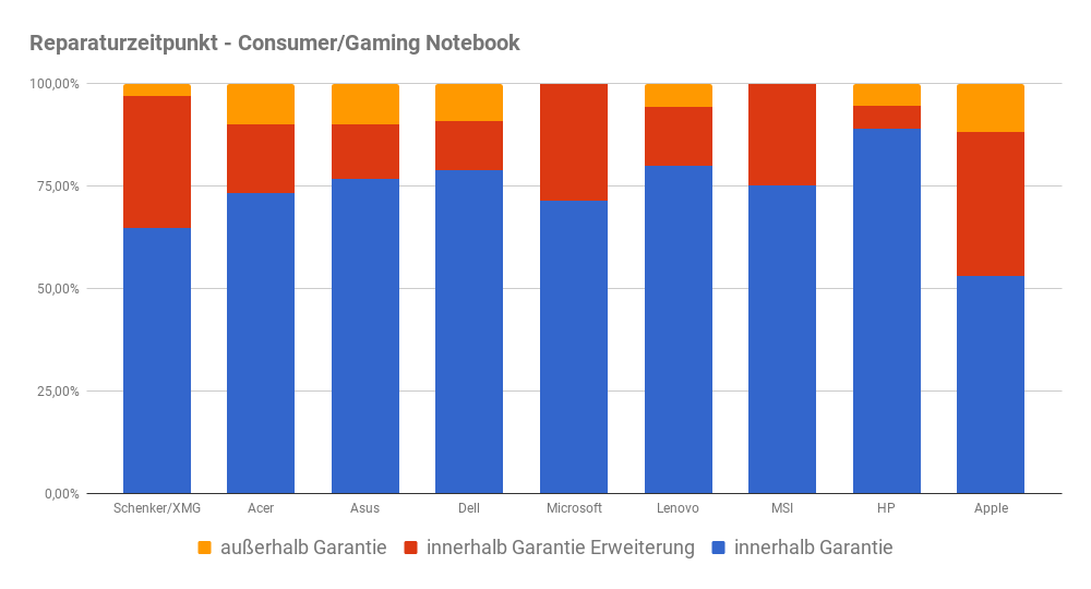 Den größten Anteil an Reparaturen innerhalb einer allfälligen Garantieerweiterung weist, wie schon im Vorjahr, Apple auf. Dies gilt auch für die Reparaturen außerhalb einer Garantie. Erklärbar ist dies einerseits mit der kurzen Standardgarantie bei Apple-Notebooks von nur einem Jahr, andererseits mit höheren erzielbaren Wiederverkaufspreisen bei vorhandener Restgarantie. Am wenigsten neigten HP-Kunden dazu eine Erweiterung der Basisgarantie abzuschließen.