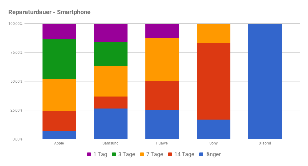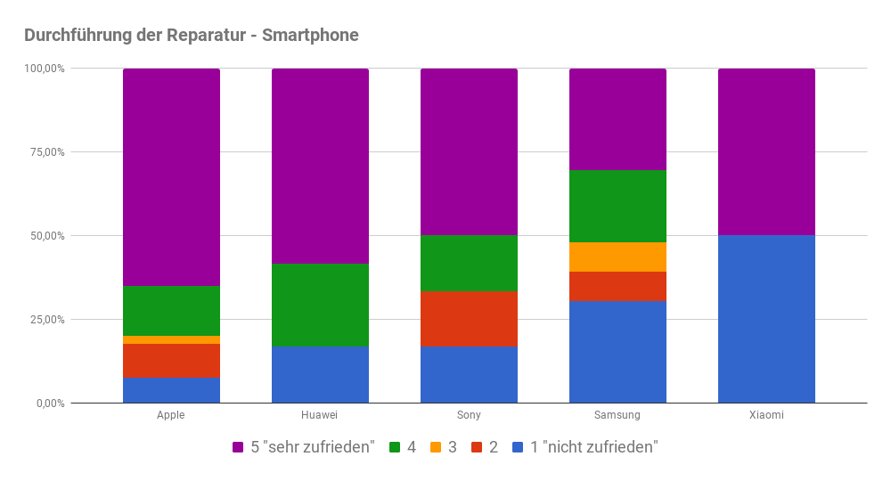 Ähnlich der Verteilung bei der Reparaturdauer gestaltet sich auch das Bild bei der Zufriedenheit mit der Reparatur bei den Smartphones. Apple, Huawei und Sony verzeichnen überwiegend sehr zufriedene Kunden, während beim Newcomer Xiaomi rund die Hälfte unzufrieden verbleibt.