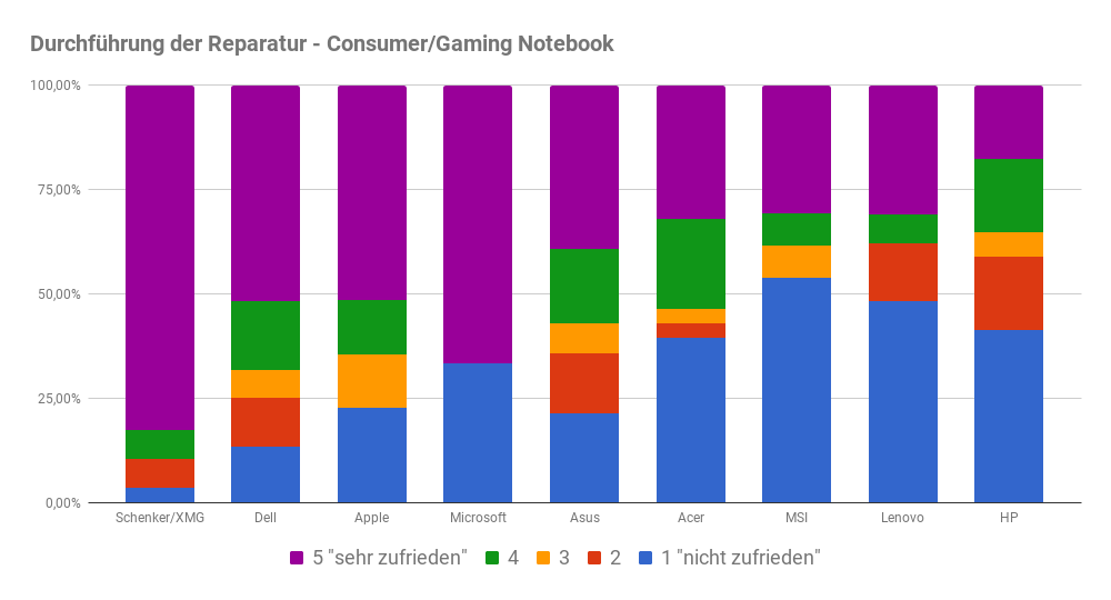 Überaus zufrieden mit dem Prozess waren Kunden von Schenker/XMG sowie von Microsoft, wobei sich bei letztgenanntem auch etliche Kunden unzufrieden äußerten. Überwiegend einfach gestaltete sich der Prozess auch bei Dell, Acer, Asus, Apple und MSI. Lediglich bei HP und Lenovo sind unter den Consumer- und Gaming-Notebook-Kunden auch zahlreiche eher unzufriedene Kunden anzutreffen.