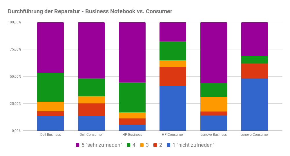Im Vergleich Business- vs. Consumer-Notebooks zeigt sich, mit Ausnahme von Dell, wo sowohl Nutzer von Consumer- und Business-Laptops gleichermaßen großteils eine sehr hohe Zufriedenheit mit der Reparaturdurchführung attestierten, bei HP und Lenovo ein sehr großer Unterschied hinsichtlich Zufriedenheit zwischen Nutzern von Consumer-Laptops und Business-Notebooks.