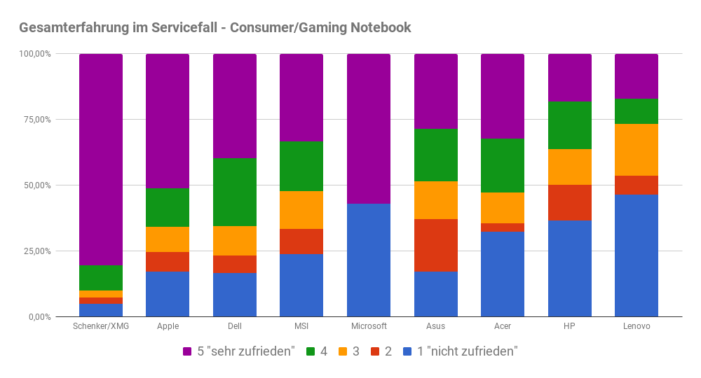 Mit mehr als 75 % "sehr zufriedenen" Kunden führt Schenker/XMG das Feld mit Abstand an. Im Mittelfeld tummeln sich Apple, Microsoft, Asus und Acer mit immerhin mehr als 50 % zufriedenen und sehr zufriedenen Kunden. Weniger glücklich waren zahlreiche Kunden von MSI, Lenovo und HP.