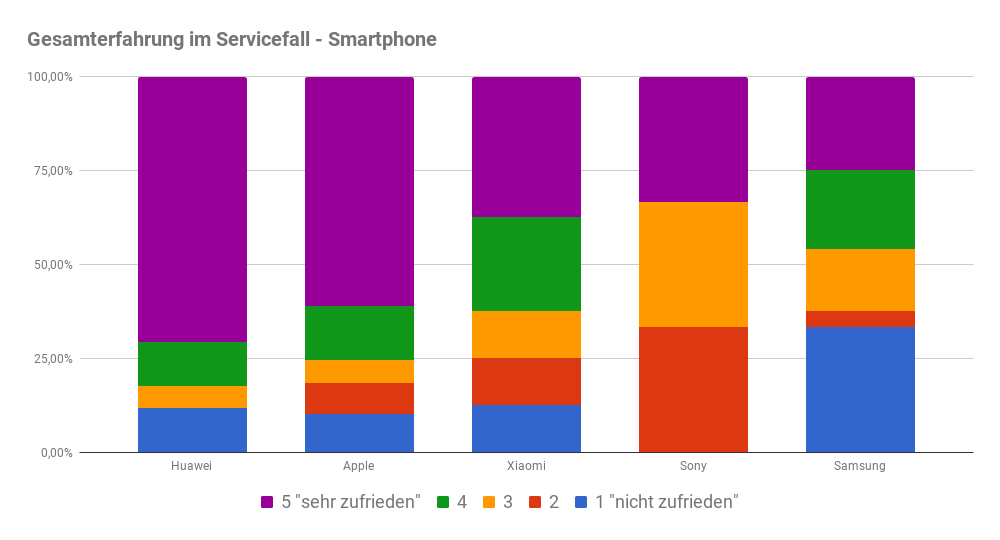 Angeführt wird das Feld in diesem Jahr von Apple während Samsung ein paar Plätze verliert. Verbessern kann sich Huawei, die den Anteil an zufriedenen Kunden in diesem Aspekt deutlich steigern konnten.