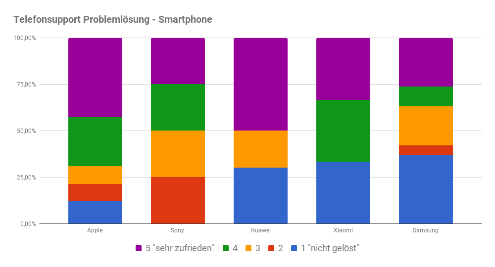 Klar voran bei den Smartphones liegt ein weiteres Mal Apple, mit rund 70 % sehr zufriedenen und zufriedenen Kunden hinsichtlich der Problemlösungsfähigkeit des Telefonsupports. Im Vergleich zum Vorjahr sichtbar verschlechtert hat sich hingegen die Zufriedenheit von Samsung-Kunden, die aufgrund eines Problems oder Defektes die Telefonhotline bemühen mussten.