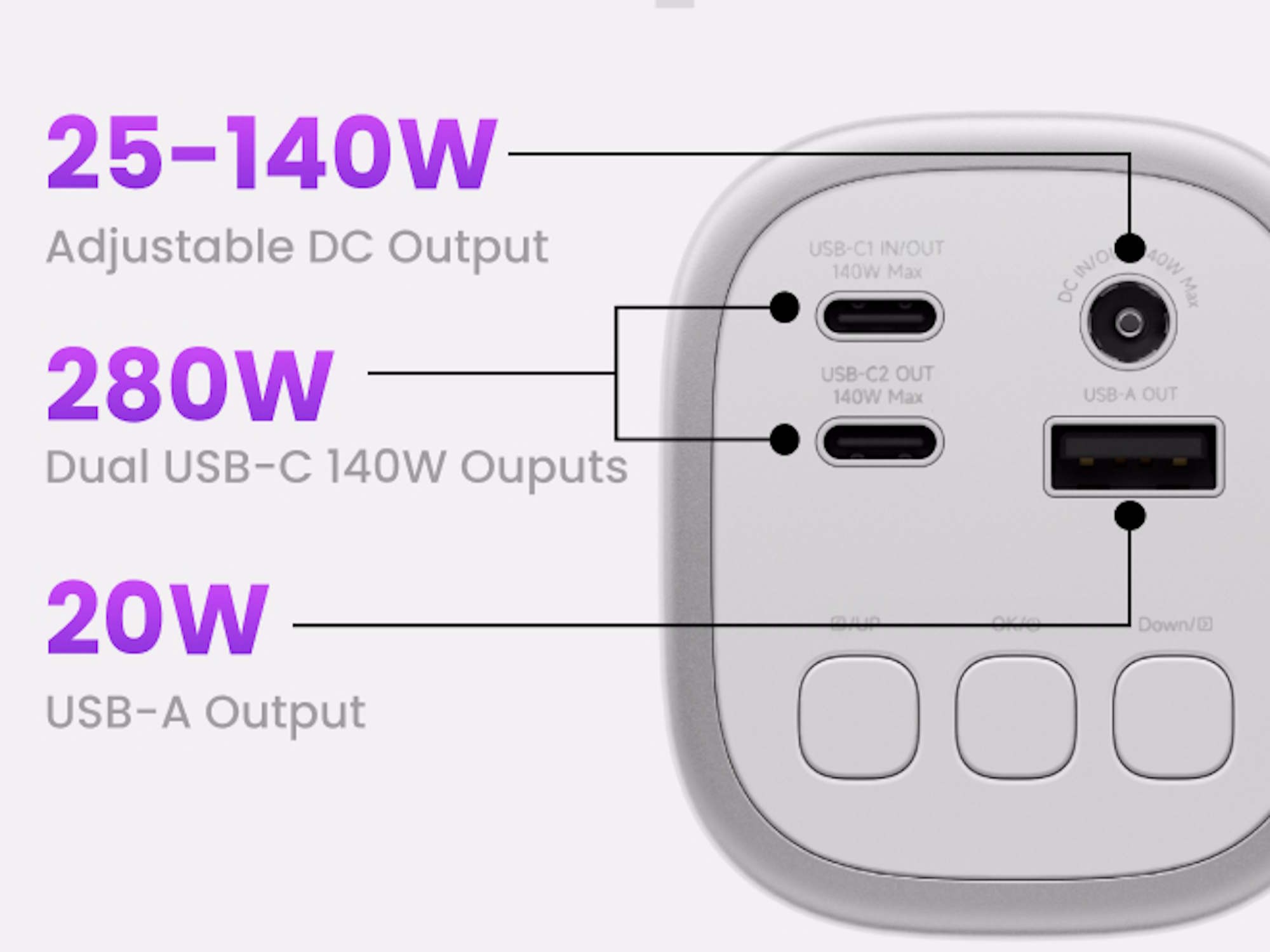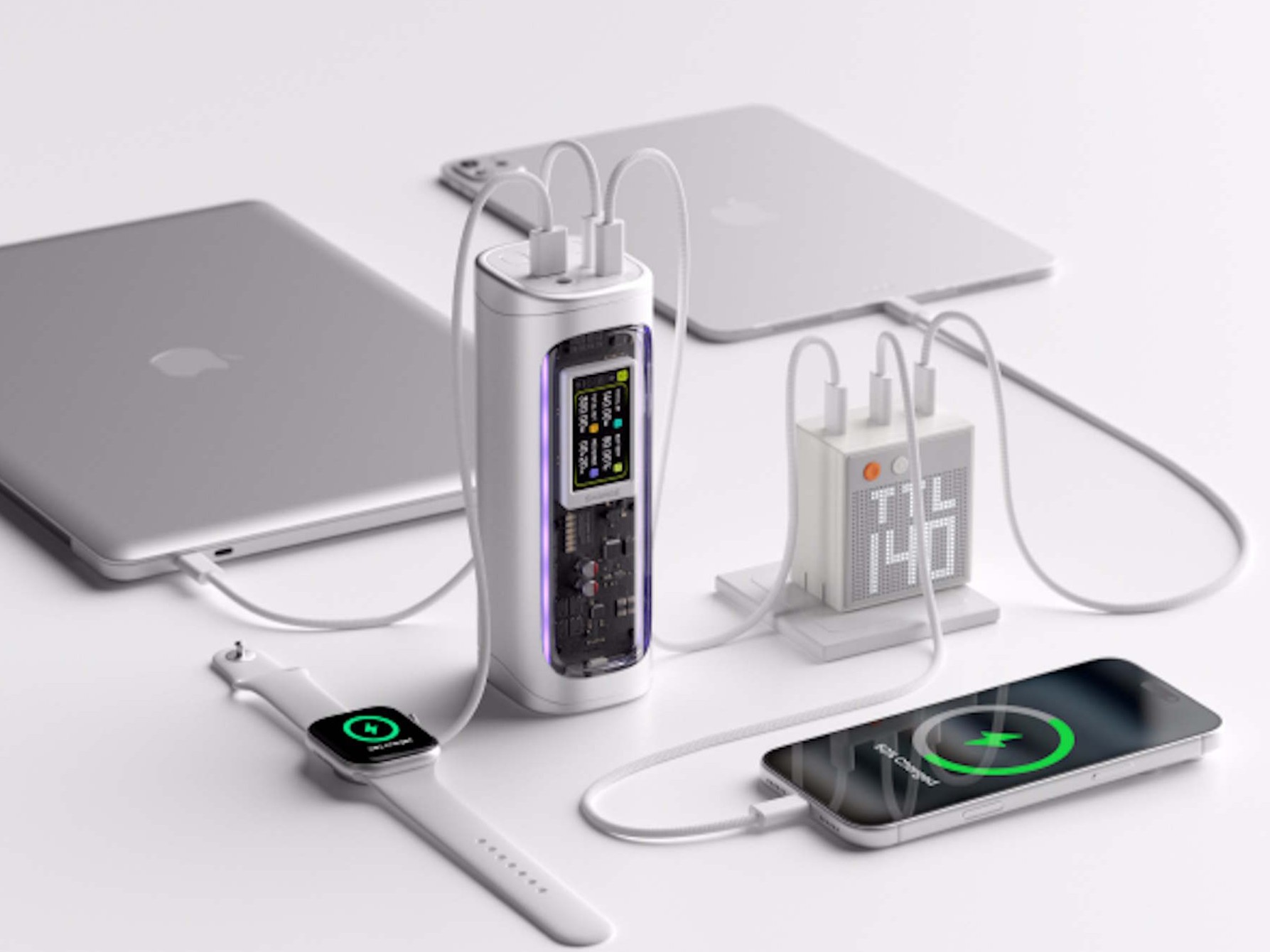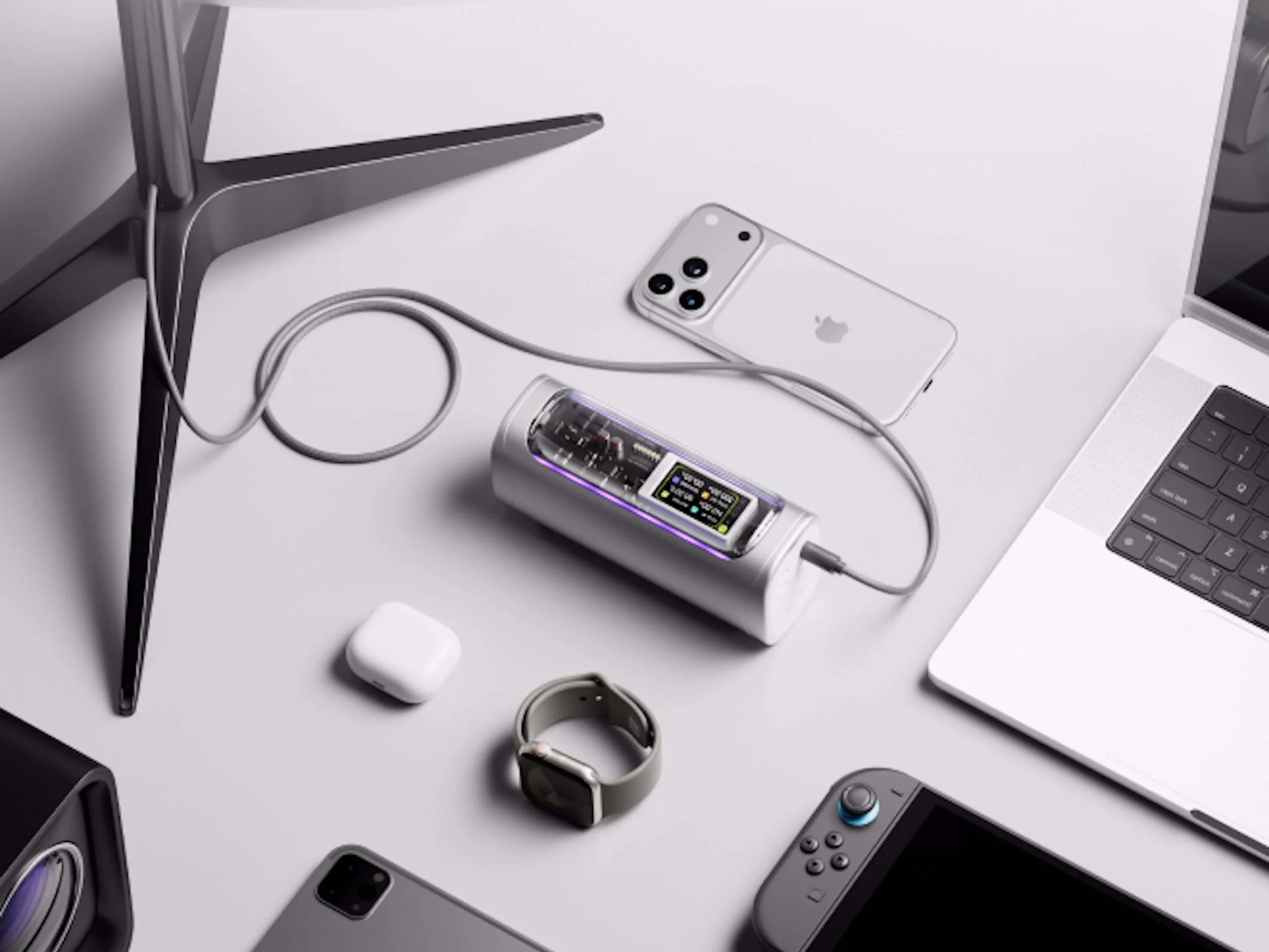 Dazu kommt noch ein USB Typ A-Anschluss und eher ungewöhnlich ein DC-Ausgang mit einem Rundstecker. Dieser kann zwischen 25 und 140 Watt ausgeben, womit sich beispielsweise eine Beleuchtung ohne USB Typ C mit elektrischer Energie versorgen lässt. Dabei wird eine Spannung von bis zu 26 Volt unterstützt. Geräte mit einer Leistungsaufnahme von nur einem Watt wie etwa ältere Kopfhörer oder Smartwatches sollen sich über USB ebenfalls aufladen lassen. Als optisches Schmankerl gibt es noch zwei RGB-Lichtleisten.