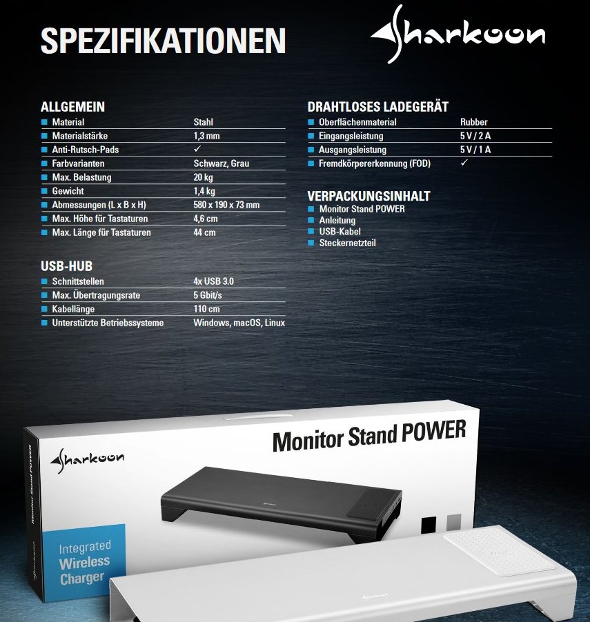 Der Monitor Stand Power verfügt rechts auf dem Displayständer zusätzlich über eine Kontaktfläche für Wireless Charging kompatibler Geräte. Dabei kann es sich um kabellose Mäuse wie die Sharkoon Skiller SGM3 oder auch Smartphones handeln. Die Aufladung erfolgt mit einer Ausgangsleistung von maximal 5 Watt. Zusätzlich lassen sich am integrierten USB-Hub bis zu 4 USB-Geräte oder -Sticks anschließen. Mit dem USB-3.0-Port des PCs verbunden wird der Power über ein 1 Meter langes Kabel.