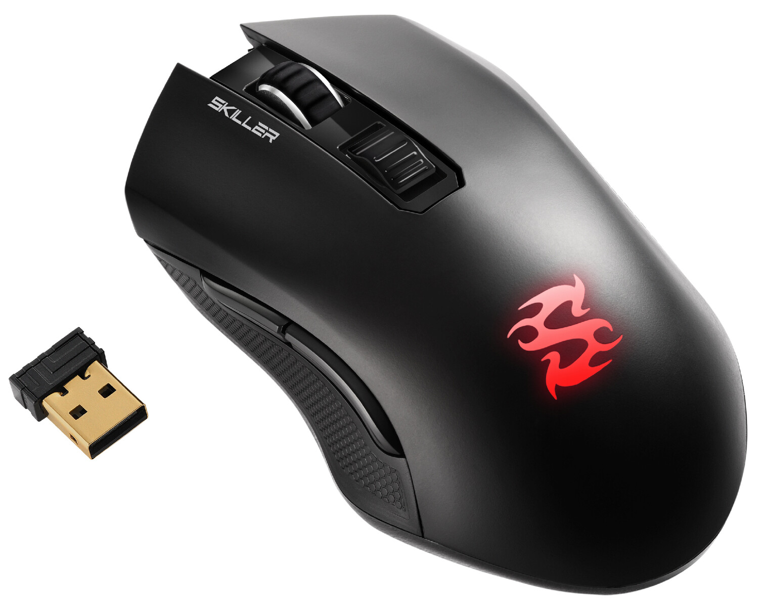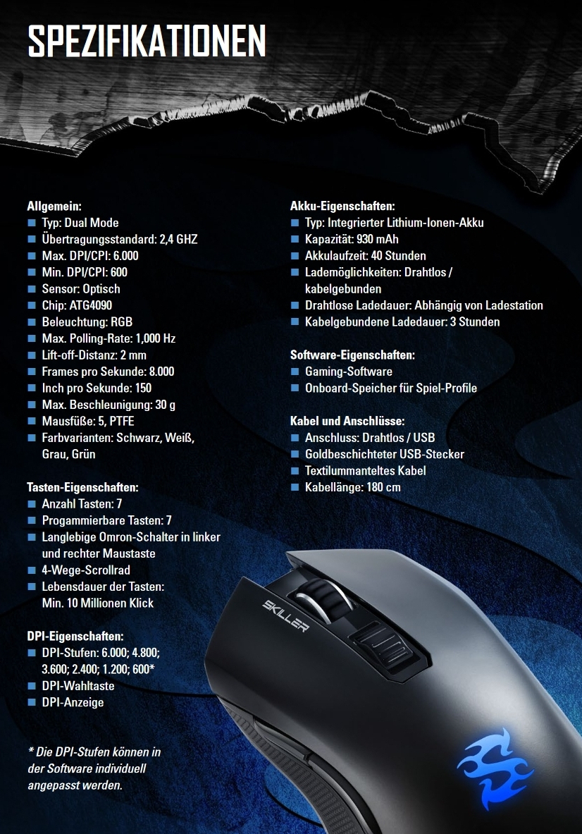 Die Skiller SGM3 zeigt über das illuminierte Skiller-Logo die aktuell gewählte Sensorauflösung an, warnt bei niedrigem Akkustand und erlaubt die Wahl einer individuellen RGB-Beleuchtungsfarbe. Gummierte Seitenflächen sorgen für Grip beim Daddeln, die 7 Tasten lassen in der Gaming-Software mit Funktionen belegen. Der integrierte Lithium-Ionen-Akku hat eine Kapazität von 930 mAh und soll der SGM3 bis zu 40 Stunden lang im Kabellos-Betrieb Energie spenden.