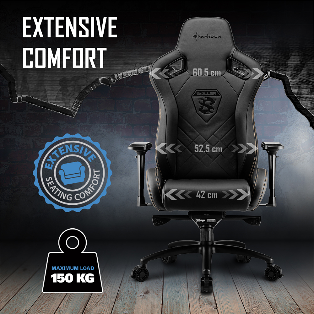 Der Sharkoon Skiller SGS5 verfügt über die großzügigen Abmessungen und Komfort-Funktionen des SGS4: Die Maximalbelastung beläuft sich also weiterhin auf 150 Kilogramm, da auch beim neuen Modell wieder eine robuste Stahlrahmenkonstruktion zum Einsatz kommt. Die empfohlene, maximale Körpergröße des Nutzers beträgt 200 Zentimeter, was durch die üppig bemessene Sitzfläche und Rückenlehnenbreite ermöglicht wird.