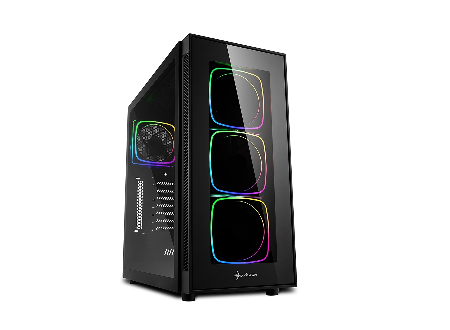 Das 45,2 x 21,5 x 46,5 Zentimeter große Sharkoon TG6 RGB bietet im Inneren verhältnismäßig viel Platz, so kann neben einem Mainboard im Mini-ITX-, Micro-ATX- oder ATX-Format eine bis zu 40 Zentimeter lange Grafikkarte und ein bis zu 16,5 Zentimeter hoher CPU-Kühler verbaut werden. Während aufgrund der geschlossenen Front die Installation eines optischen Laufwerks nicht möglich ist, können drei 3,5- und vier 2,5-Zoll-Laufwerke verbaut werden.