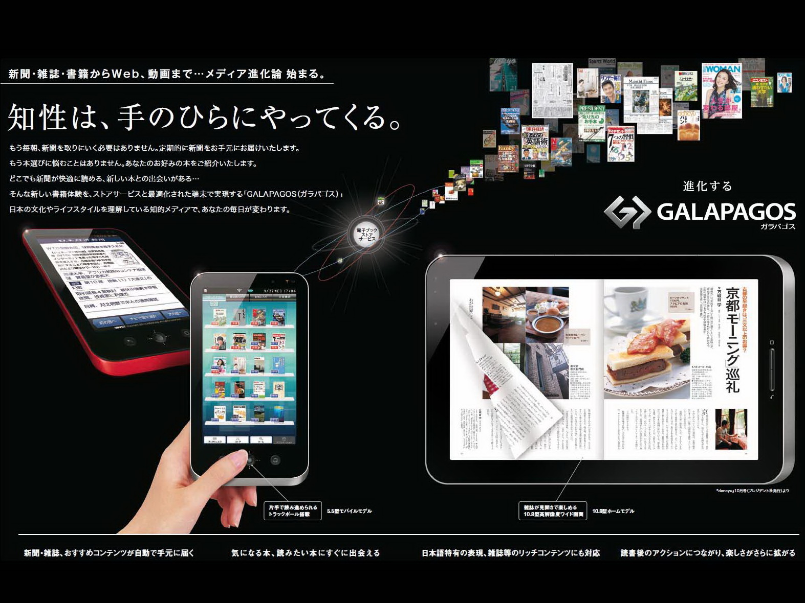Sharp hat als Android-basierte E-Book-Reader für Galapagos sowohl ein ultraportables Tablet in den Farben Rot und Silber mit 5,5-Zoll-Display und einer Auflösung von 1.024 x 600 Pixeln, als auch ein 10,8-Zoll-Modell in Schwarz mit einer kommoden Auflösung von 1.366 x 800 Pixeln vorgesehen. Beide Tablets haben zudem Wireless LAN (IEEE 802.11b/g) an Bord. Angaben zu Preisen machte Sharp bei der Präsentation nicht.