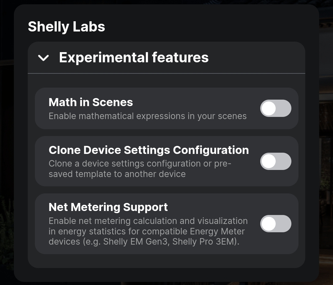 Eines der wohl interessantesten neuen Features ist die Möglichkeit, die vollständigen Einstellungen eines Gerätes abzuspeichern und auf ein anderes Gerät zu übertragen. So kann beispielsweise ein defekt gewordener Smart-Home-Aktor viel schneller ausgetauscht werden oder Einstellungen auf andere Geräte kopiert werden. Die Notwendigkeit, jedes Gerät einzeln einzustellen, entfällt somit. Da es sich um eine experimentelle Funktion handelt, muss diese zuvor in den Benutzereinstellungen im Abschnitt "Shelly Labs" aktiviert werden.