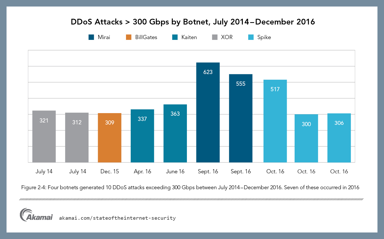 - Sieben der zwölf groß angelegten Angriffe mit mehr als 100 Gbit/s im vierten Quartal 2016 lassen sich dem Mirai-Botnet zuordnen.