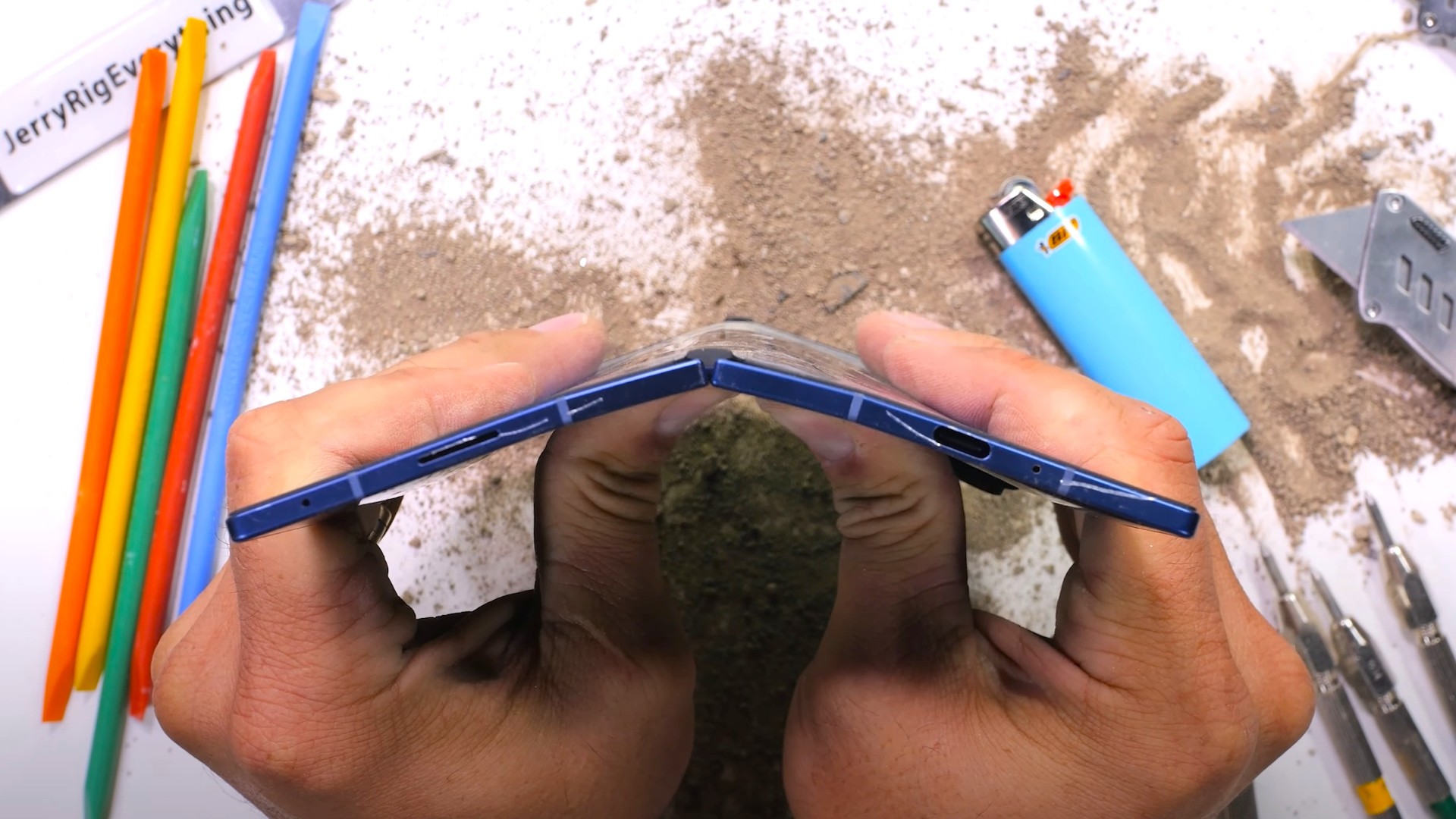 Spannend und teils sehr gefährlich sieht der Bend-Test aus. Bisherige Samsung-Foldables haben die Tortur überlebt, waren aber auch alle mehr als 10 mm dick. Nicht so das Galaxy Z Fold7, das unseren Messungen nach aufgeklappt 4,2 mm dünn ist und zusammengeklappt je nach Messpunkt zwischen 8,55 mm und 9,05 mm misst. Zusammengeklappt überlebt es den Bend-Test dennoch bravourös und selbst aufgeklappt schafft es der Durability-Tester nicht, das Galaxy-Foldable gegen die Faltrichtung zu brechen. Wie das Bild oben zeigt verbiegt es sich zwar sehr stark, doch weder das Display, das Glas noch das Gehäuse bricht, auch Funktionsausfälle werden nicht beobachtet. Faszinierend!