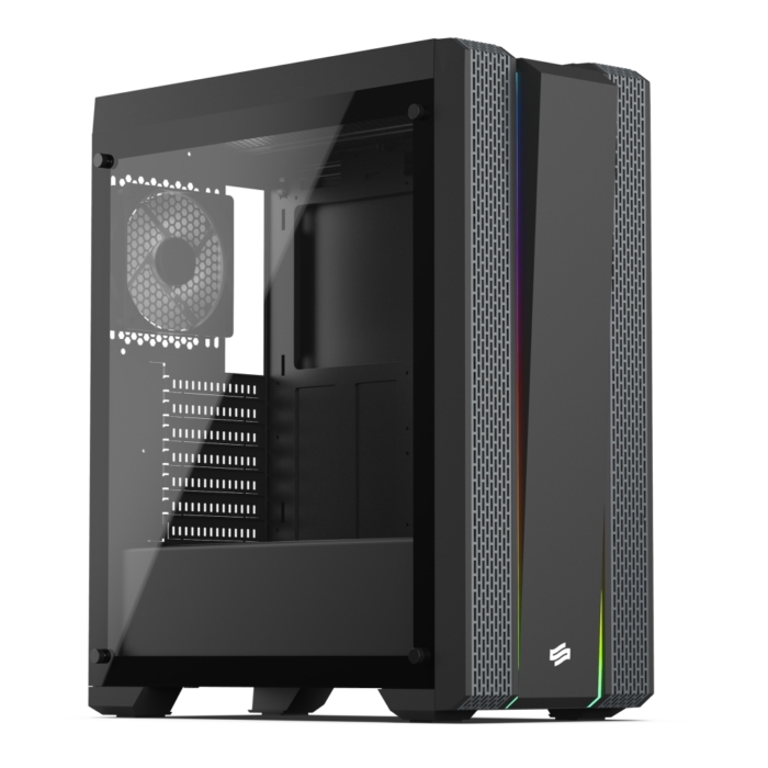 Bereits auf dem ersten Blick fallen beim Gladius GD8 TG ARGB die beiden RGB-Streifen auf, welche nicht nur die Front, sondern auch die Gehäuseoberseite durchziehen. Die zahlreichen RGB-LEDs lassen sich wie üblich über ein kompatibles Mainboard steuern, ein Schalter am Frontpanel erlaubt auch die Steuerung ohne entsprechendes Mainboard.