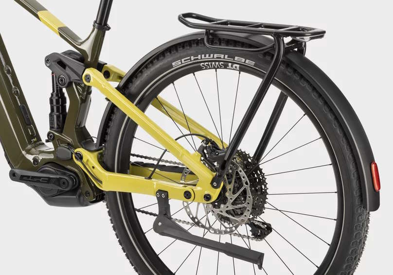 Das Stomp AL :e ist ein neues SUV-E-Bike, welches seinem Namen dabei mit Federgabel und Dämpfer und auch einer sehr umfangreichen Ausstattung alle Ehre machen soll. So handelt es sich sozusagen um ein Fully-Mountainbike mit der Ausstattung eines Trekking-E-Bikes. Dementsprechend sind eine Beleuchtung ebenso vorhanden wie ein Fahrradständer und Schutzbleche. Ein Gepäckträger zählt zur Ausstattung. Dieser bietet wie durchaus üblich noch eine zweite Ebene und damit zusätzliche Streben links und rechts, in welche sich Gepäcktaschen einhängen lassen.