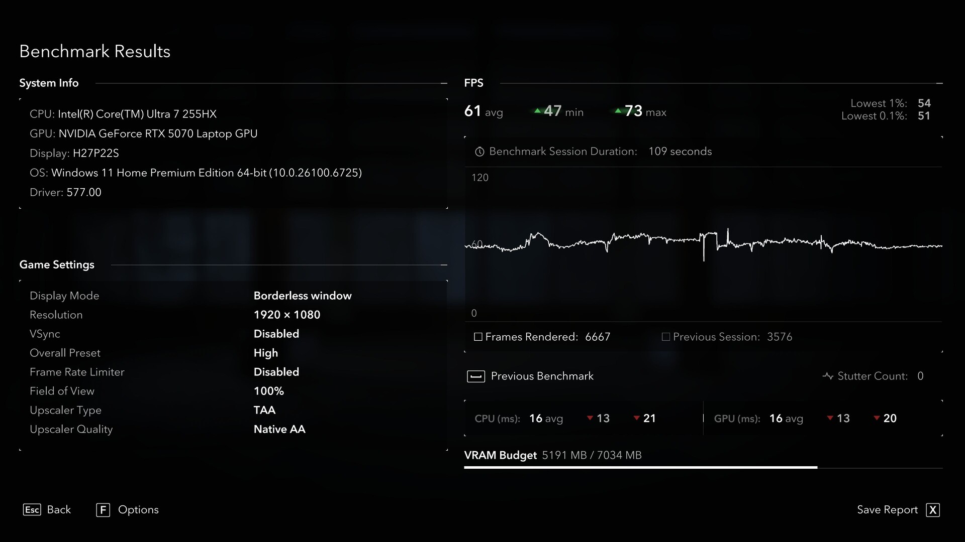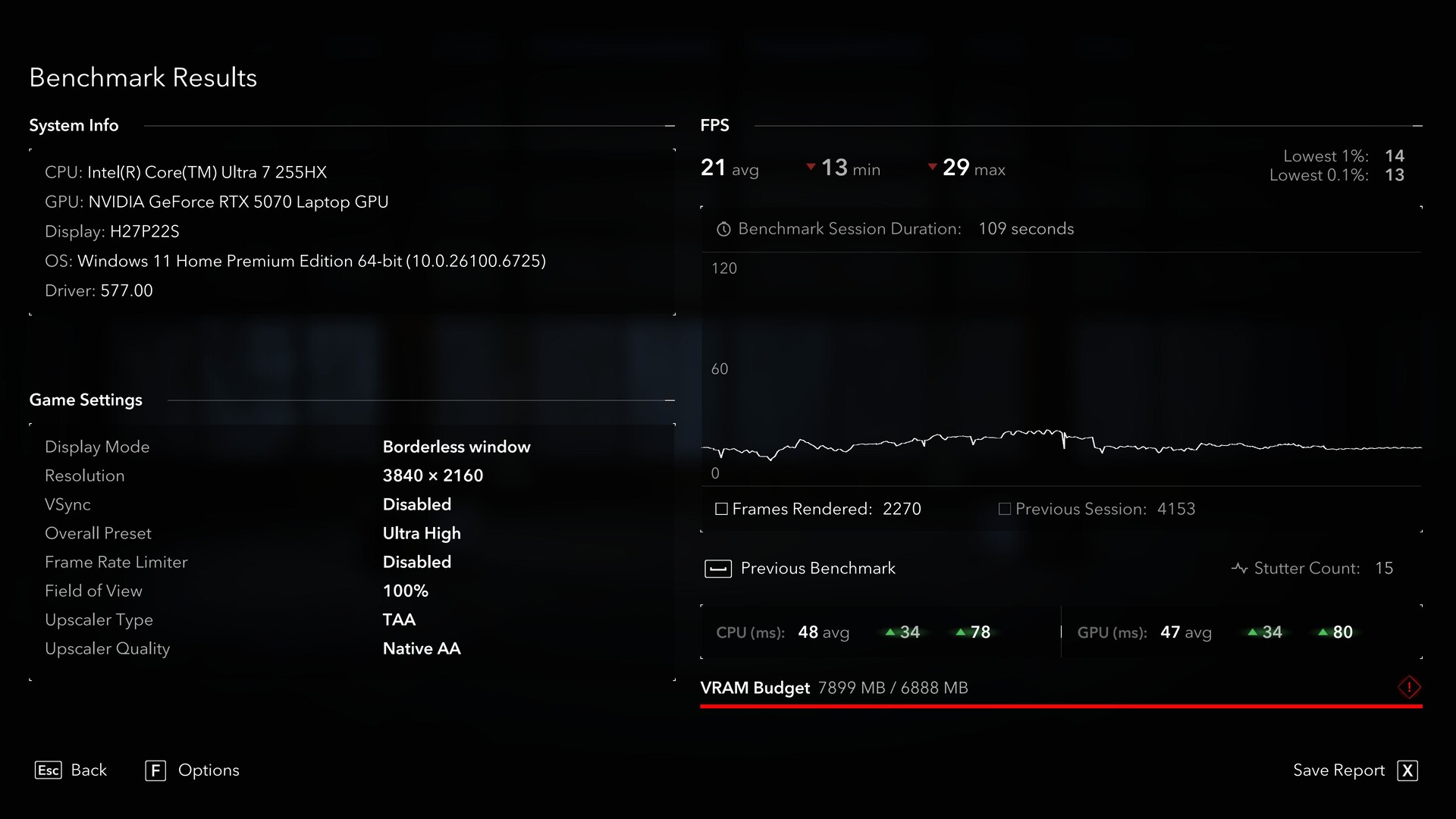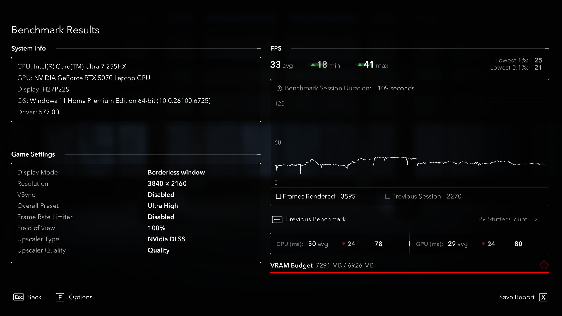 Beispielsweise bescheinigt uns Assassin's Creed Shadows in 2.560 x 1.440 (QHD), dass das VRAM-Budget um etwa 100 MB überschritten ist. Im anschließenden Benchmarks äußert sich das jedoch ohne jeden Ruckler, auch die Frametimes erweisen sich als sehr konstant, obwohl sich die durchschnittlichen fps nur bei 38 einpegeln. Der interne Stutter Count liegt bei 1.
