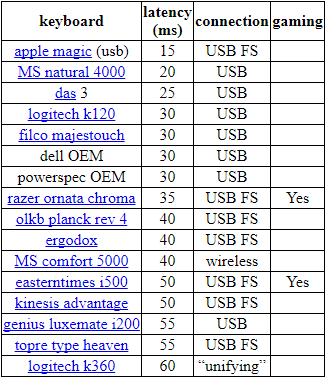 Und die Ergebnisse waren ziemlich überraschend. Die Tastatur mit der niedrigsten Latenz im Test war Apples Magic Keyboard 2, mit gerade mal 15 ms. Gleichzeitig hatten ausgewiesene Gaming-Keyboards, wie die Razer Ornata Chroma oder die Easterntimes 1500 (auch bekannt als Tomoko MMC023) Latenzen von 35 und 50 ms. Betrachtet man die Zahlen genauer, stellt man fest, dass viele Tastaturen eine Latenz aufweisen, die sogar noch über der gesamten Ende-zu-Ende-Pipeline eines Apple-II-Computers aus den 70er Jahren liegt. In die Befehlskette zwischen dem Tastendruck auf der Tastatur und dem Erscheinen des Buchstabens auf dem Bildschirm spielt die Latenz der Tastatur somit eine sehr wichtige Rolle.