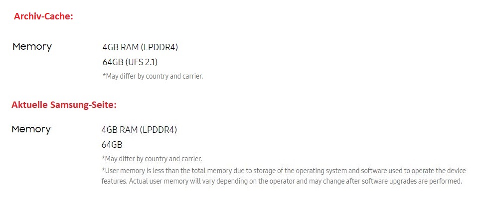 Nachdem Huawei beim Mate 9 dabei ertappt wurde, nachträglich die Webseite um die UFS 2.1-Spezifikation bereinigt zu haben (mittlerweile ist die ursprüngliche Variante wieder online und Huawei hat den Fehler offenbar eingesehen), scheint sich bei Samsung ein ähnlicher Skandal anzubahnen. Auch der große südkoreanische Hersteller verbaut offenbar unterschiedliche Speichertechnologien in sein aktuelles Flaggschiff Galaxy S8 und Galaxy S8+ und hat die UFS 2.1-Spezifikation nachträglich von der globalen Webseite entfernt, wie das Bild unten im Vergleich mit einer gecachten Version beweist. Die Links zur Cache-Version und der aktuellen Samsung-Webseite sind in den Quellen unten zu finden.